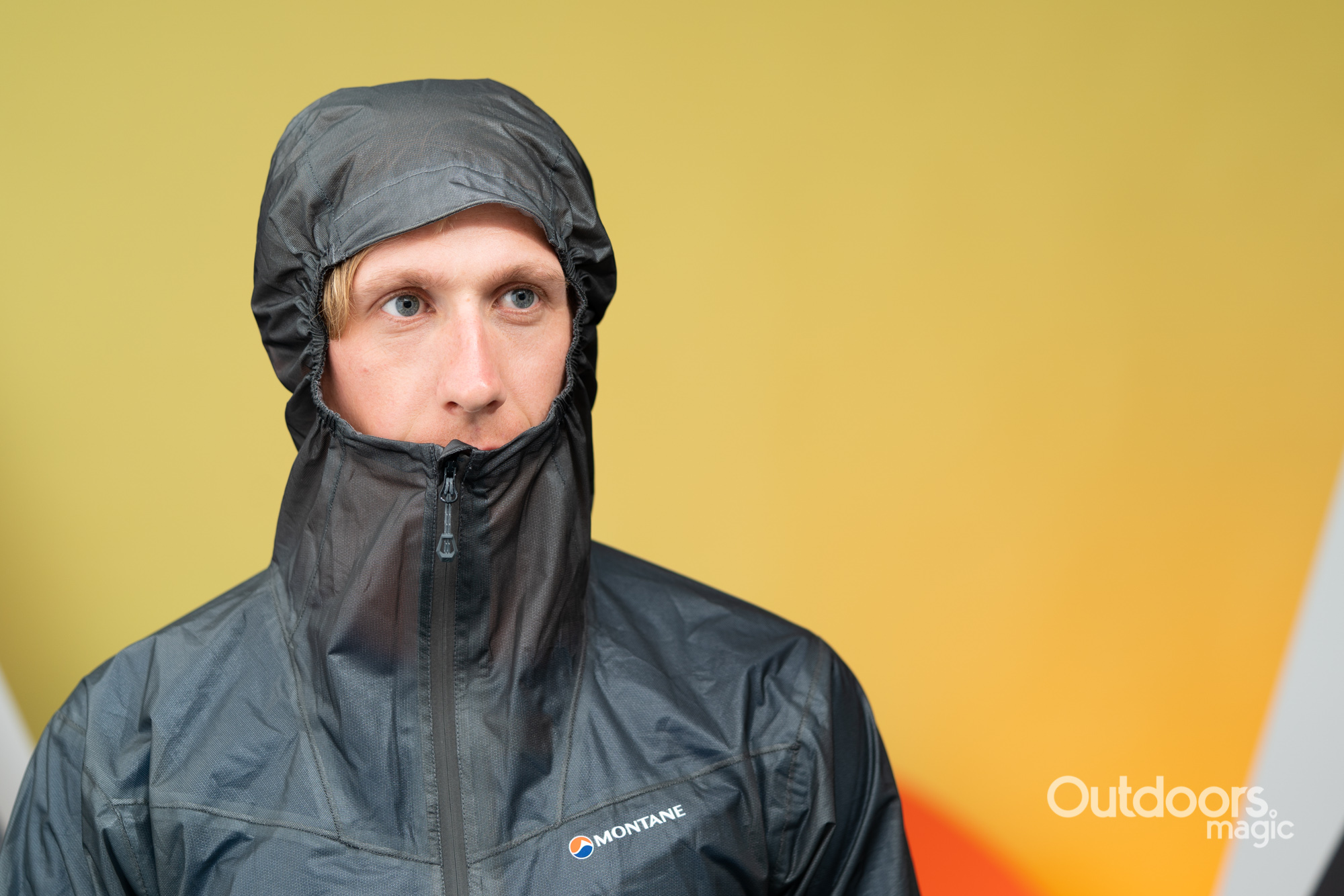 The waterproof material Montane have opted for with the podium is a micro fabric called Aqua Pro Lite. It’s super, super thin. So thin it’s actually slightly transparent. Don’t worry, it’s not as fickle as it might sound. It actually feels slightly tougher than some similar jackets in its category. The face fabric is light ripstop nylon, then there’s the membrane and underneath that they’ve sprayed on a PU laminate to act as a backer. In other words it’s a 2.5 layer jacket.