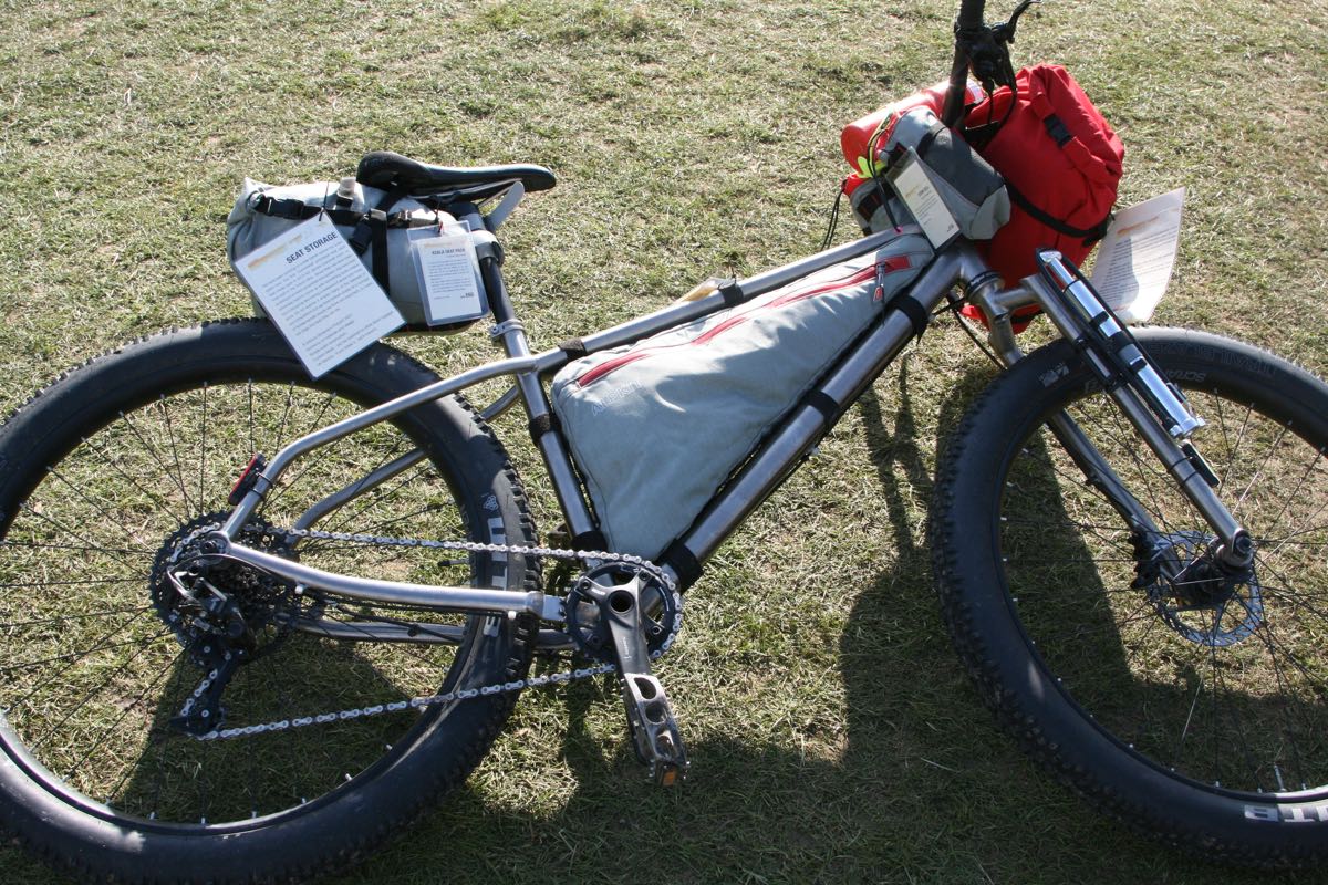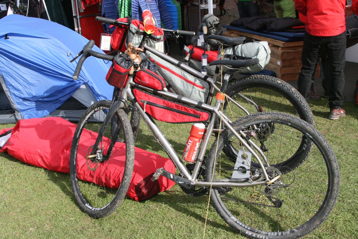 First off, is a titanium backpacking frame that’s based around rare 650B ‘semi-fat’ wheels and tyres – just think ‘big and fat’ if the technical jargon leaves you baffled. It has a rigid titanium fork, though a suspension option may be offered later, and distinctive arched seat-stays, the tubes that connect the rear wheel and the seat-tube.