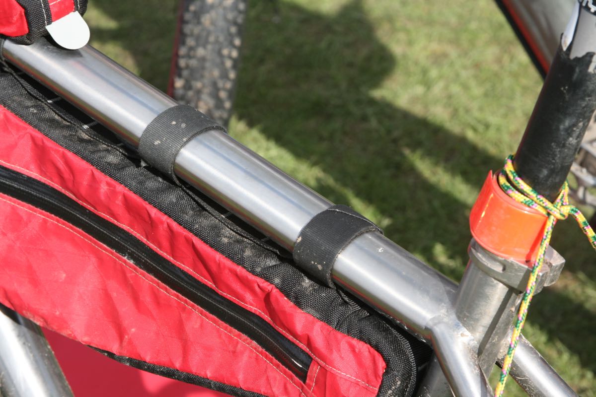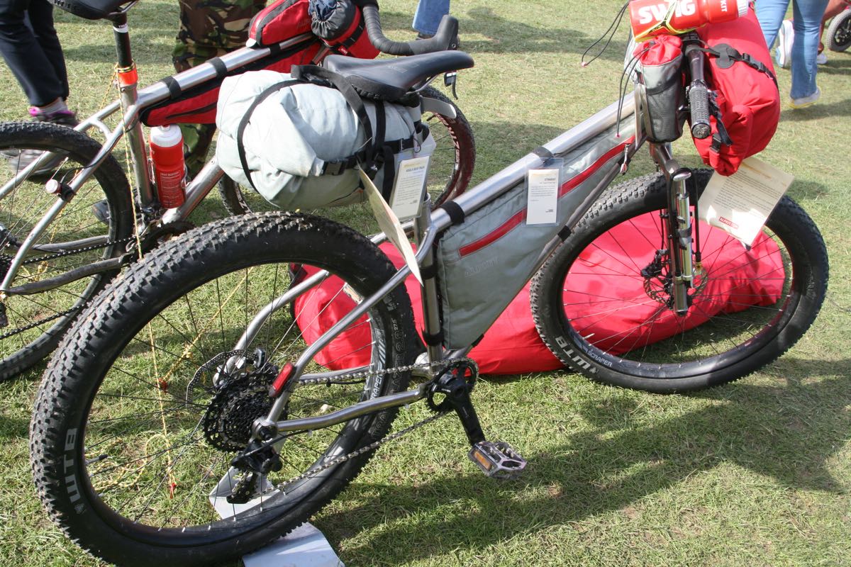 It also features an unusual flat, wide, ovalised top tube, that no-one we spoke to was quite sure about, but should be ideal for strapping bags to we guess as well [update} as having ride quality benefits. Designed to be used with mountain bike bars rather than drops, it definitely looks distinctive.