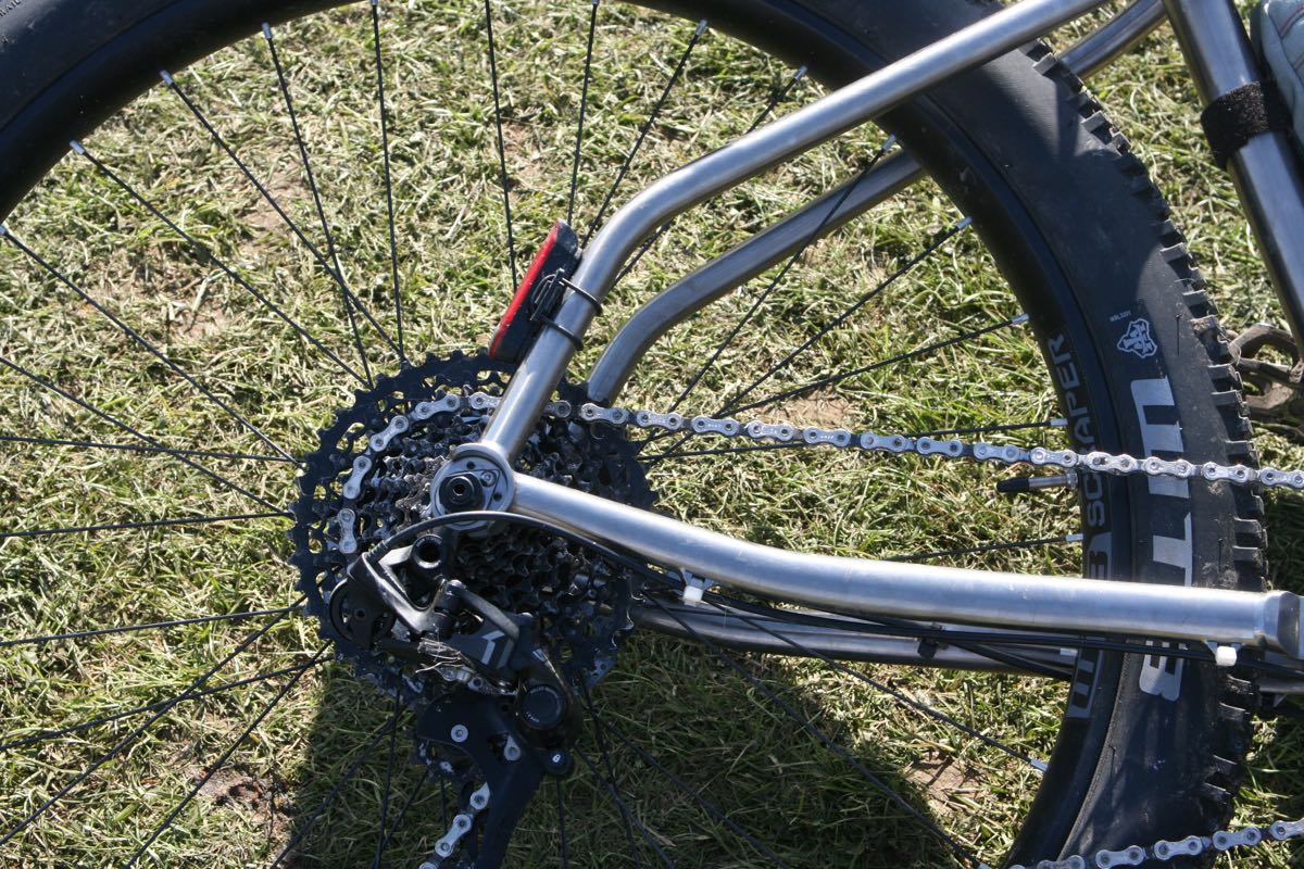 Finally, and we managed to somehow not photograph this, there’s a good old aluminium-framed 650B trail bike that should be a lot more affordable than either of the titanium bling brothers with a frame only cost of just £300 or so, though the proto is specced with enough swank kit that the build cost would be close to £4000, gulp… Full production bikes should be a lot less however.