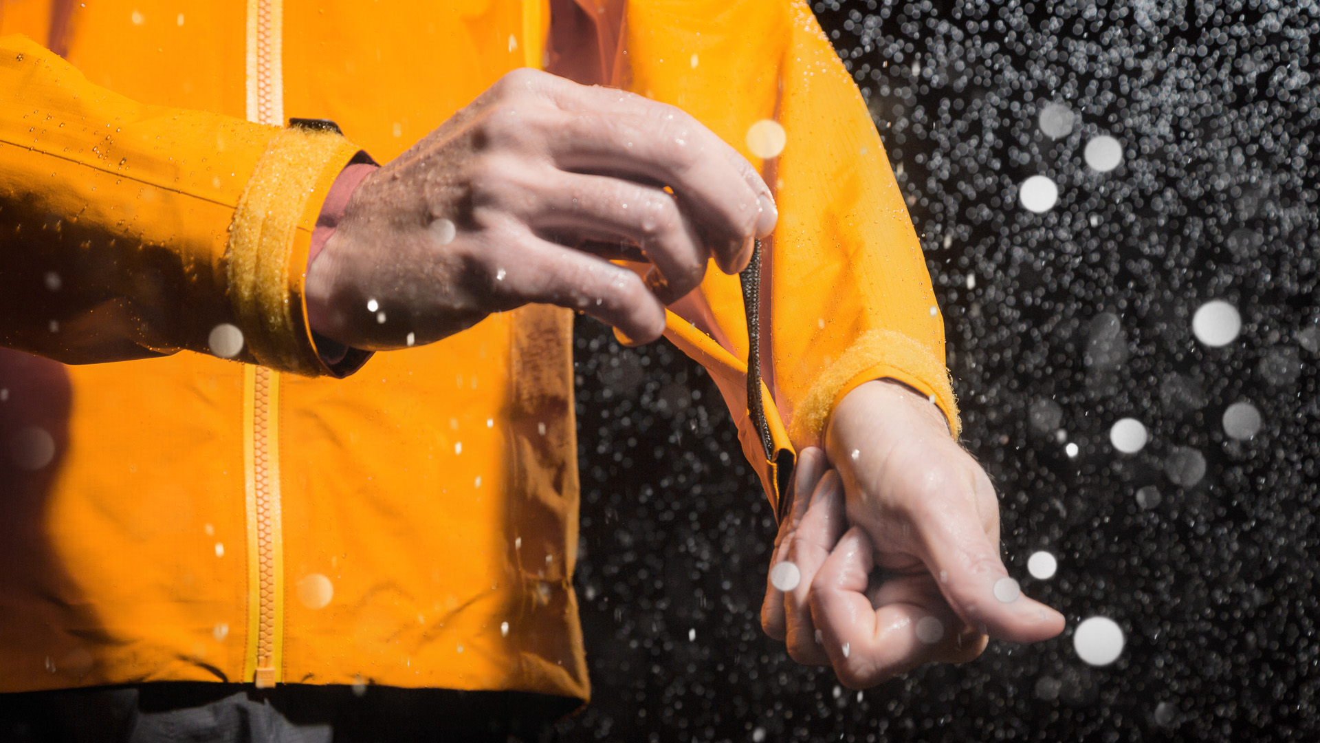 Waterproof mountaineering jacket / Gore-Tex Pro 3L fabric / helmet-compatible DropHood / Micro-seam allowance (1.6 mm) / chin guard with brushed microsuede facing / WaterTight™ external zippers / laminated pit zippers / WaterTight™ Vislon front zip/ zipper garages / die-cut Velcro® cuff adjusters / adjustable dropback hem / two high-volume hand pockets / internal chest pocket with laminated zip / reinforced shoulders and arms