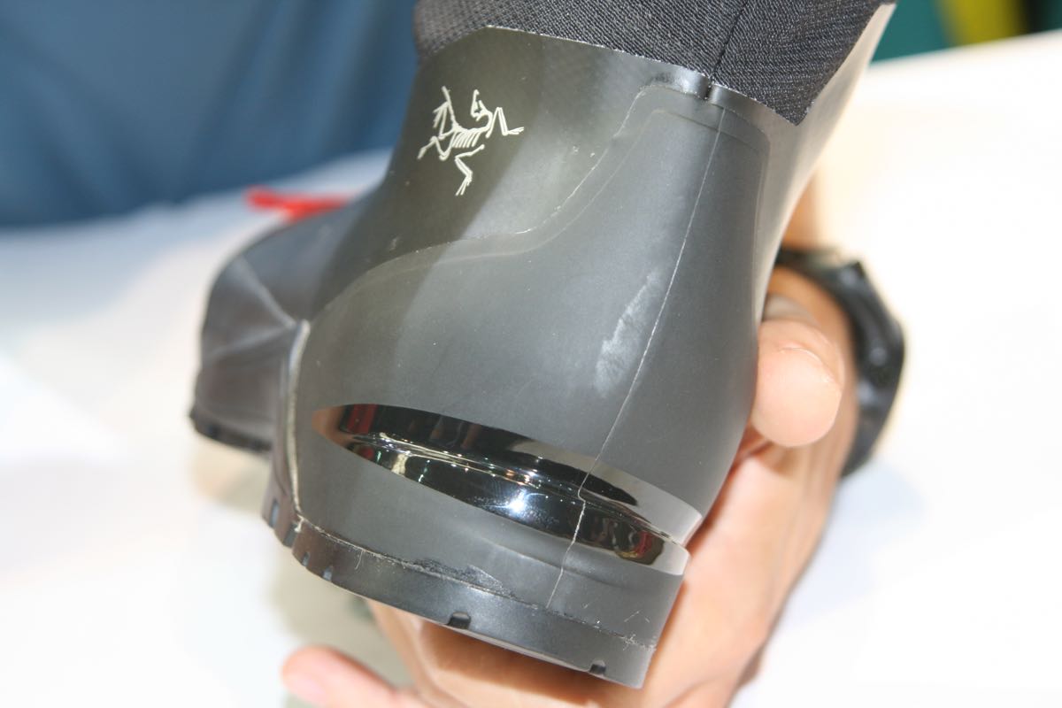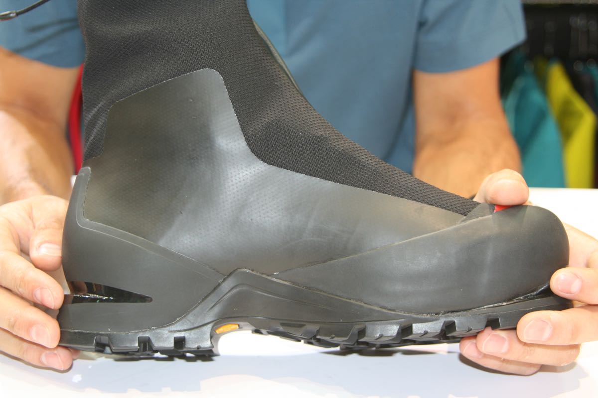 No question that the star of the Arc’teryx show was the new Acrux AR GTX Alpine Boot. We were talked through the fundamentals of the new boot by top product manager Jon Rockefeller. Superficially it looks similar to something like the Scarpa Phantom range thanks to the integral gaiter, but there’s a lot more going on under the surface.