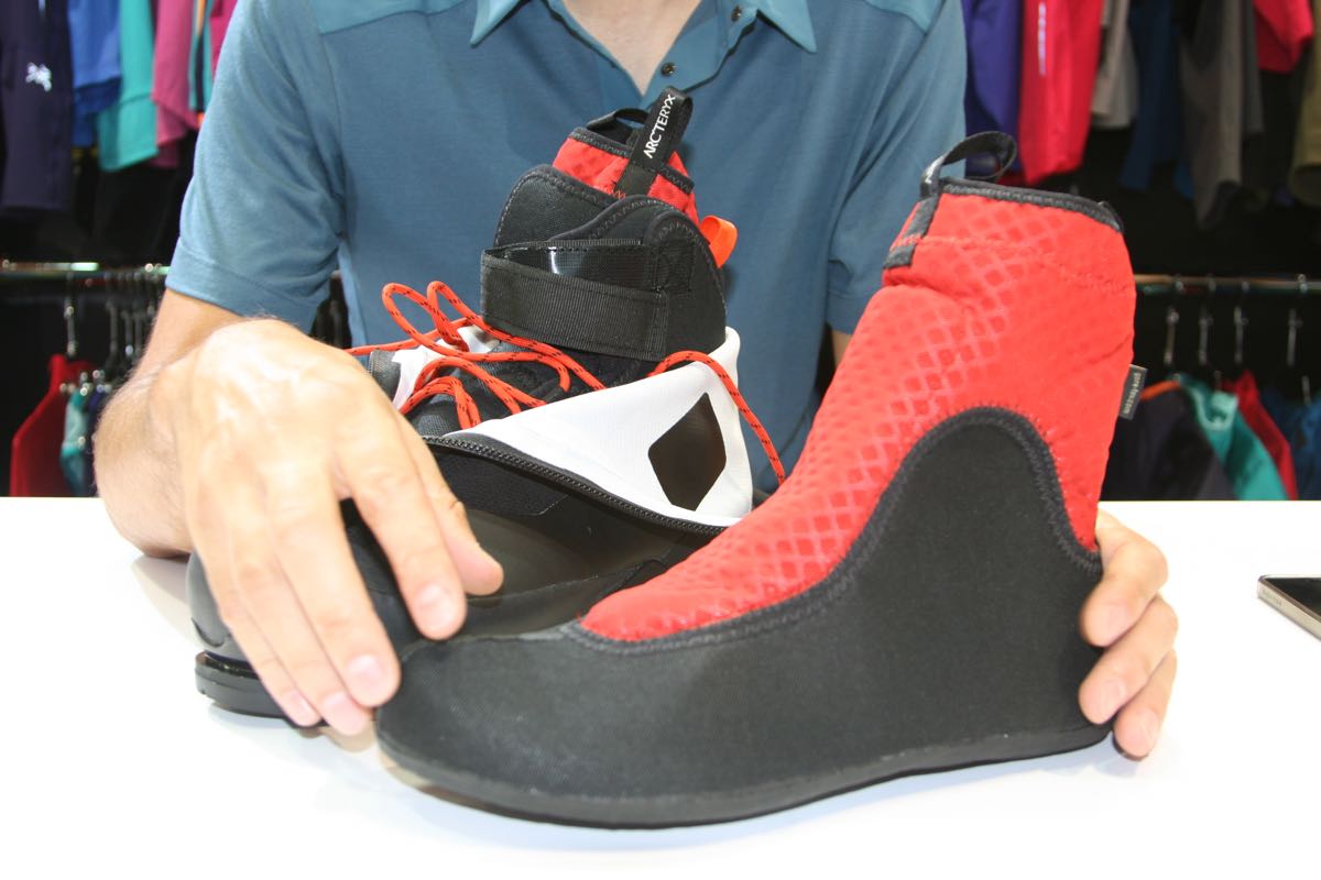 The big news from Arc’teryx at OutDoor was the launch of the brand’s first full-on mountaineering boot for spring 2016, the Acrux AR GTX Alpine Boot, a radical double-boot design that has similar external dimensions and weight to a conventional boot, but the insulation and fast-drying properties of a double one.