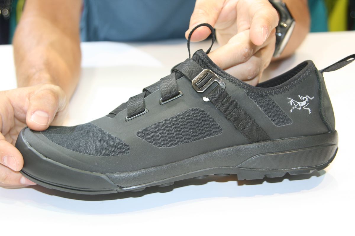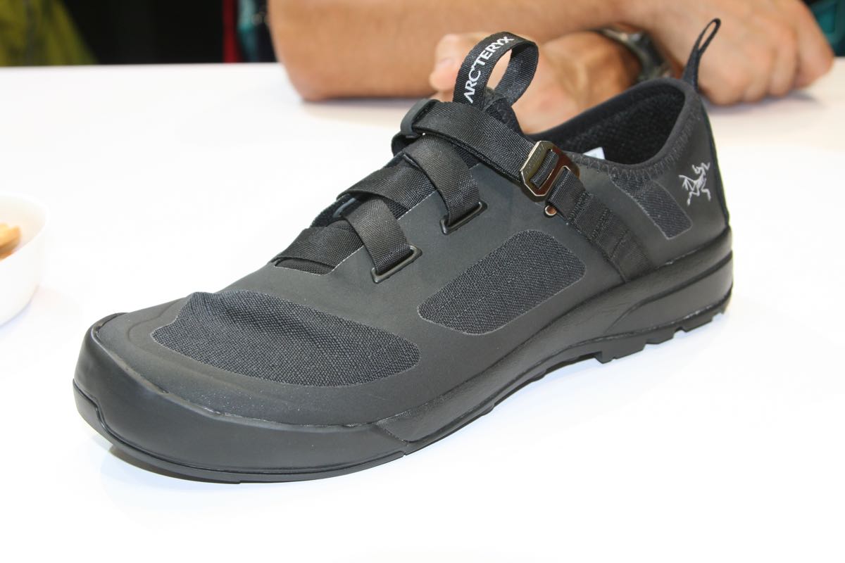 It’s a neat-looking thing with an unusual single-hand adjustable webbing strap closure, a climbing-orientated sticky rubber Vibram sole and a laminated upper with lightweight TPU protection.