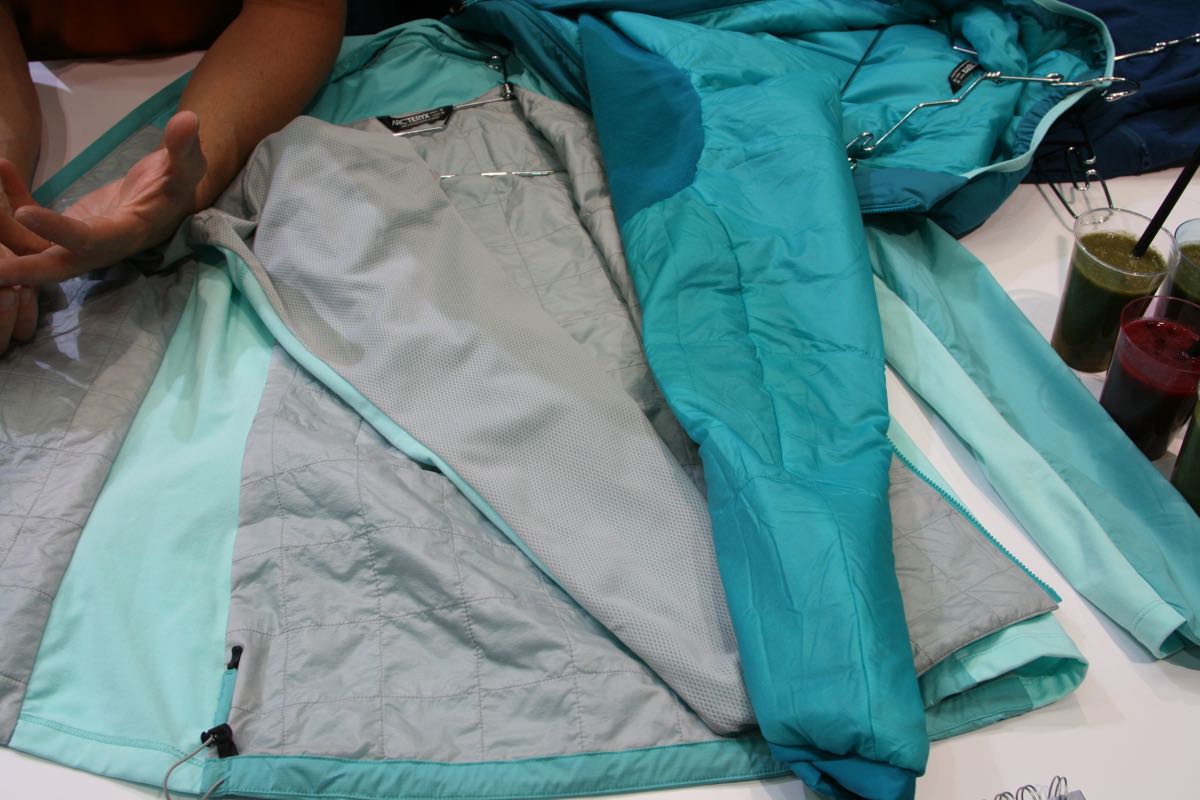 Last but not least, Arc’teryx has a new SL – Super Light – take on its Atom synthetic insulated jackets. Like the existing LT it’s zoned with lightweight polyester fleece stretch side panels, but with Coreloft Compact synthetic insulation on the front and back of the trunk.