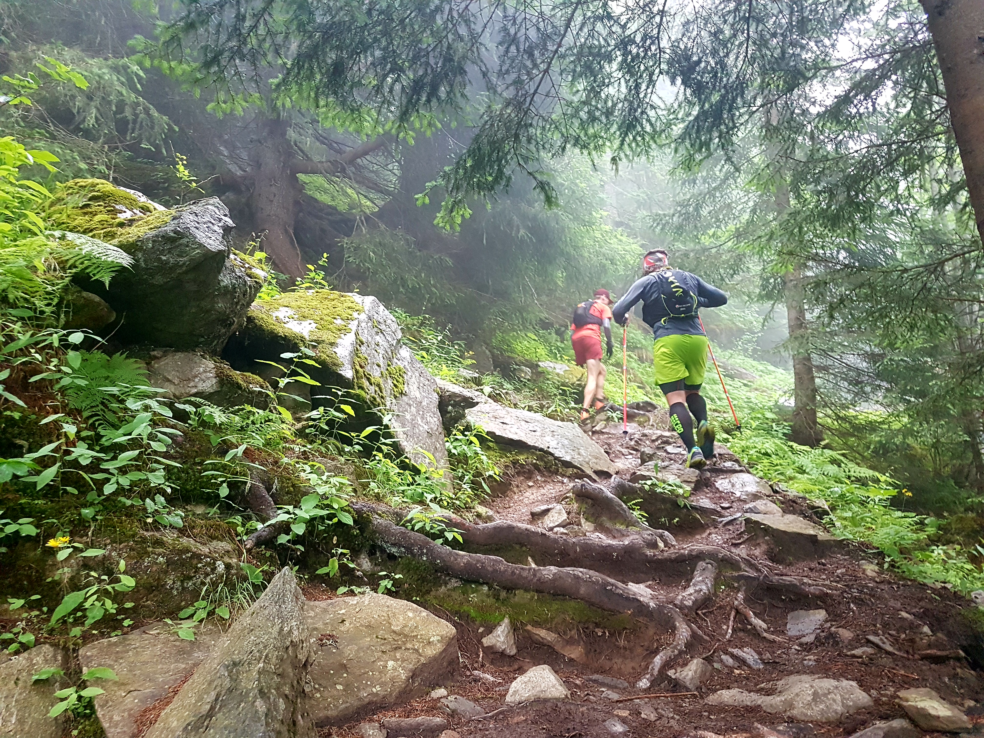 We ran a 22-mile circuit that involved a climb right through thick alpine woodland to the snow line and then a long zig zagging descent back down to the town. There was mud, dirt, gravel and snow, and there were a few technical sections on wet boulders and scree.