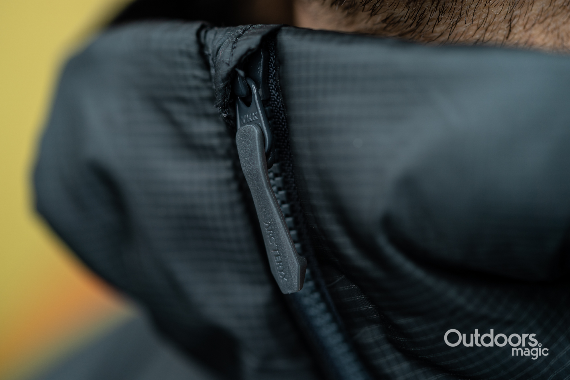 At just 325g overall the Arc’teryx Nuclei FL is by no means a heavy jacket either. One of the main contributing factors here is the outer shell, which is made from a fully windproof 10D nylon with a ripstop weave. It feels very, very thin. Not so thin that you’d need to worry about the fabric on the shoulders when wearing a heavy-loaded pack, but you’d want to be careful picking through any thick brush in it.
