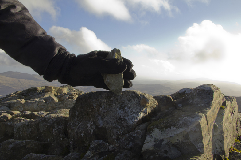 ‘‘The Intruder’ presents an inch of stone removed from the English landscape. At a glance it is seemingly insignificant and yet the material is carefully presented. Scaling the 3028ft of Scafell Pike in the Lake District, the artist has stolen the uppermost inch of the highest mountain in England. An entire nation’s height is modified and its landscape redefined by means of a single careful action.’