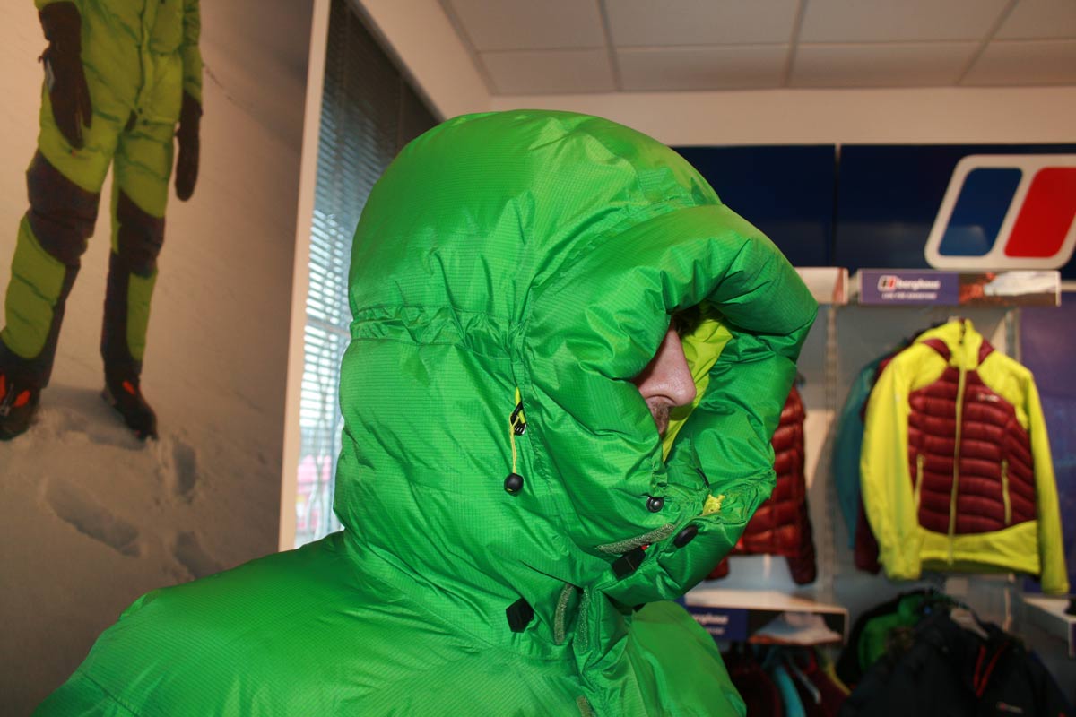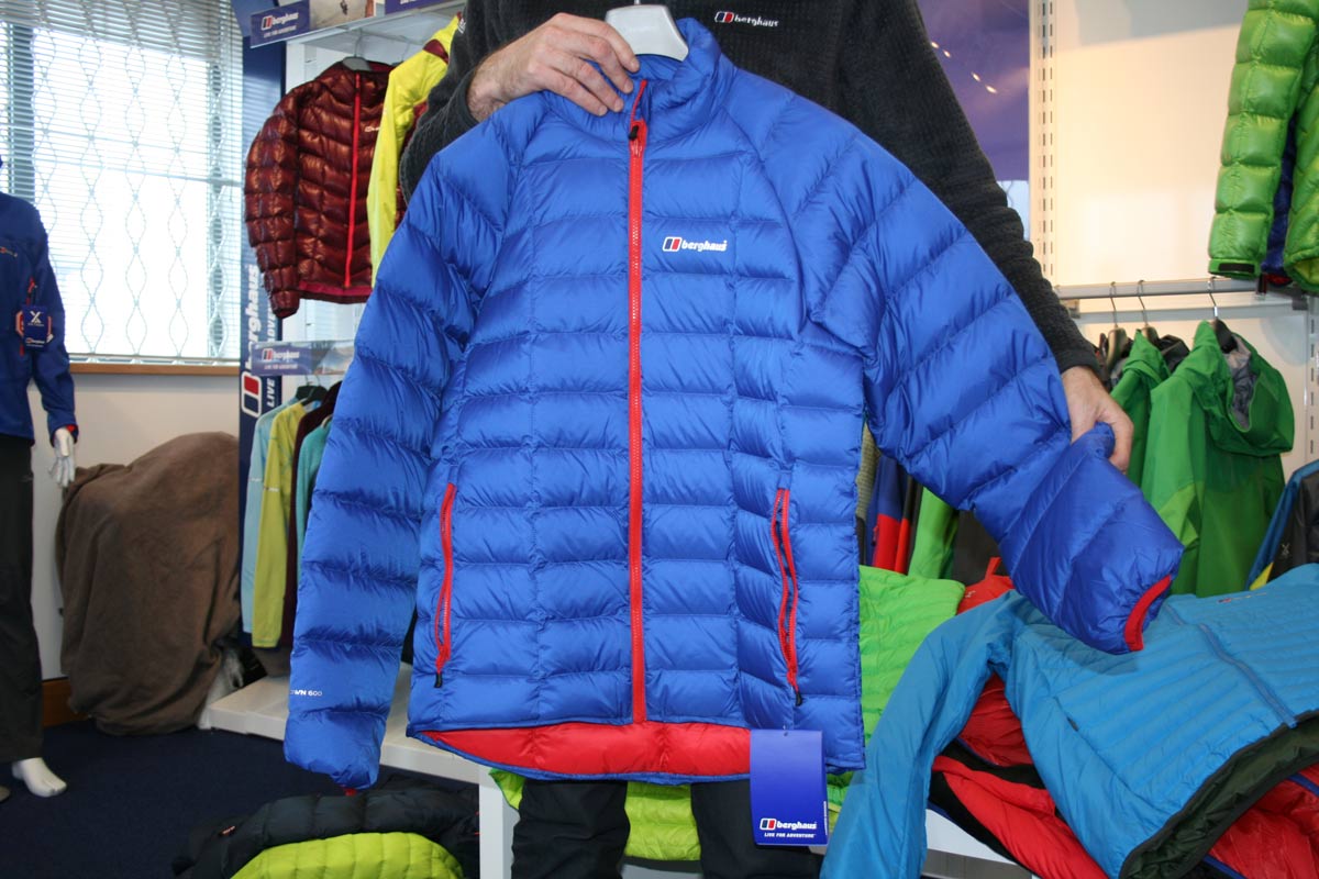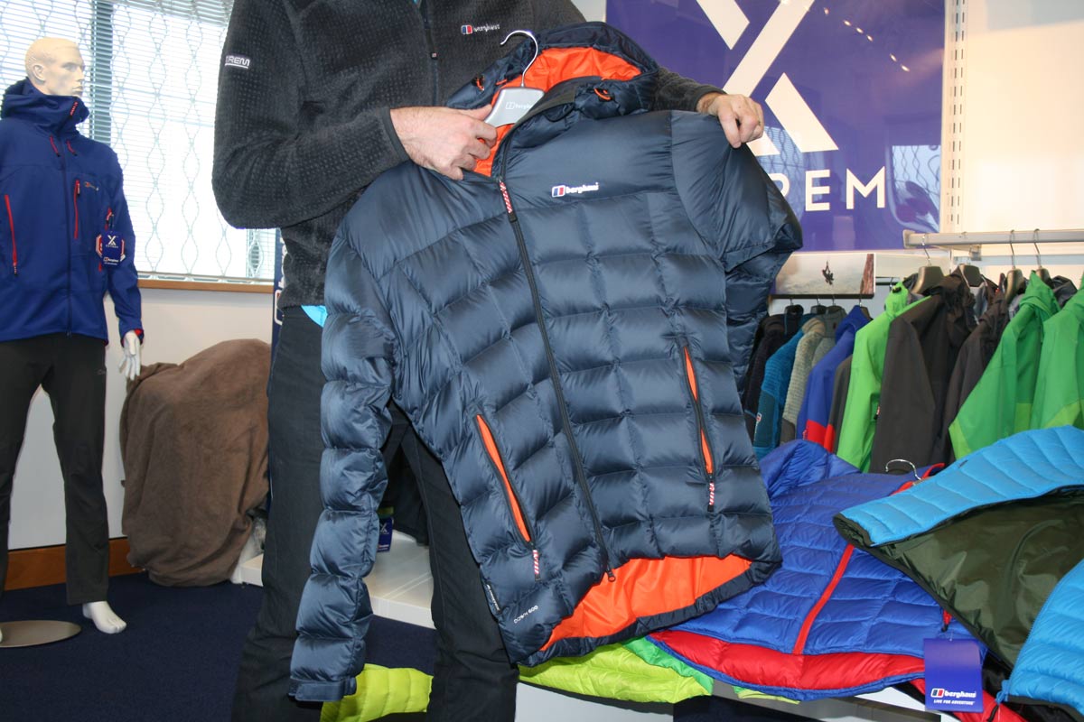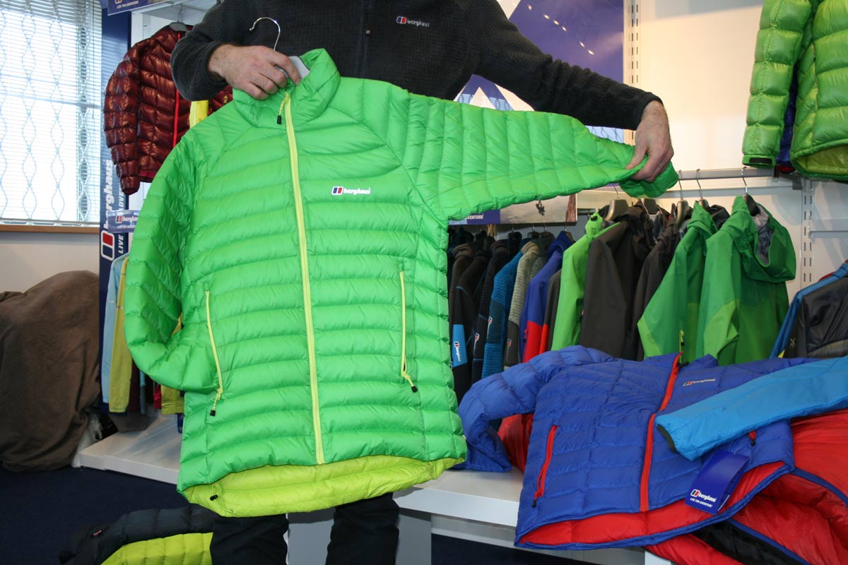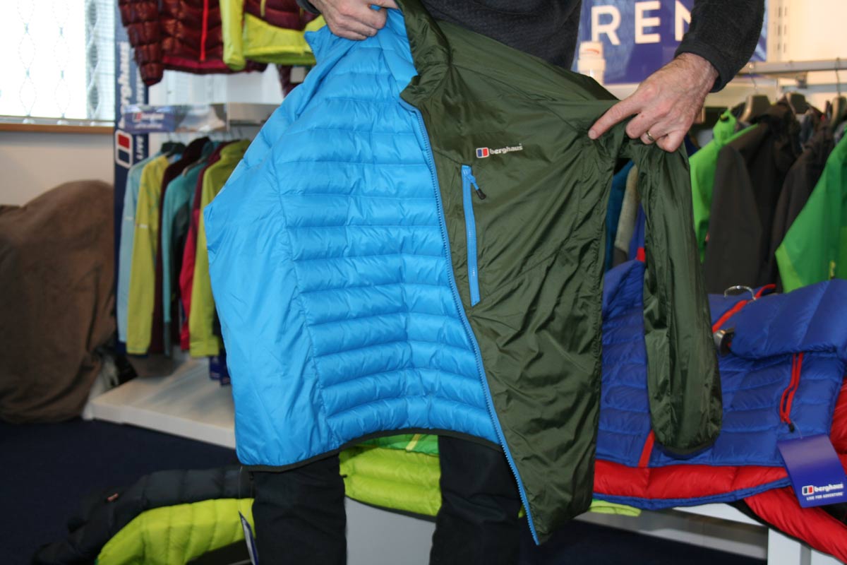 Like we said, pretty much the entire range of Berghaus down kit uses water-repellent Hyddrodown from this autumn 2013 from the Extrem range, through Mountain to the Everyday Outdoor range of kit. The green jacket on the left is the revamped Furnace Jacket which comes in both men’s and women’s versions and uses both Hydrodown and some bodymapping, with different levels of insulation at the sides of the trunk rather like the Ilam jacket. It’ll sell for £170, weighs around 350g and based on the sample we have here to play with, is suprisingly snug at that weight too.
