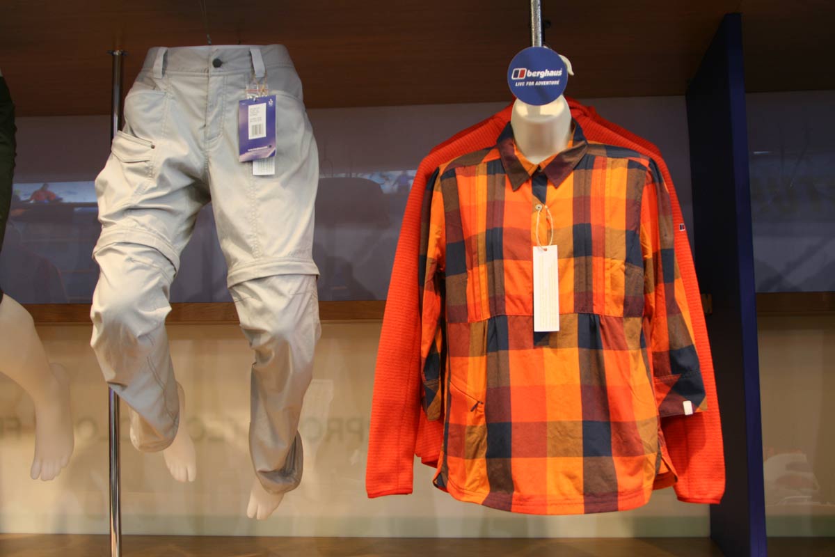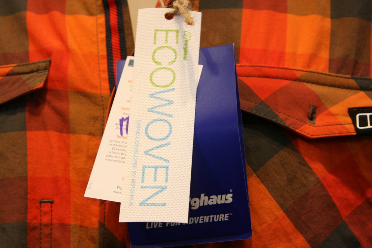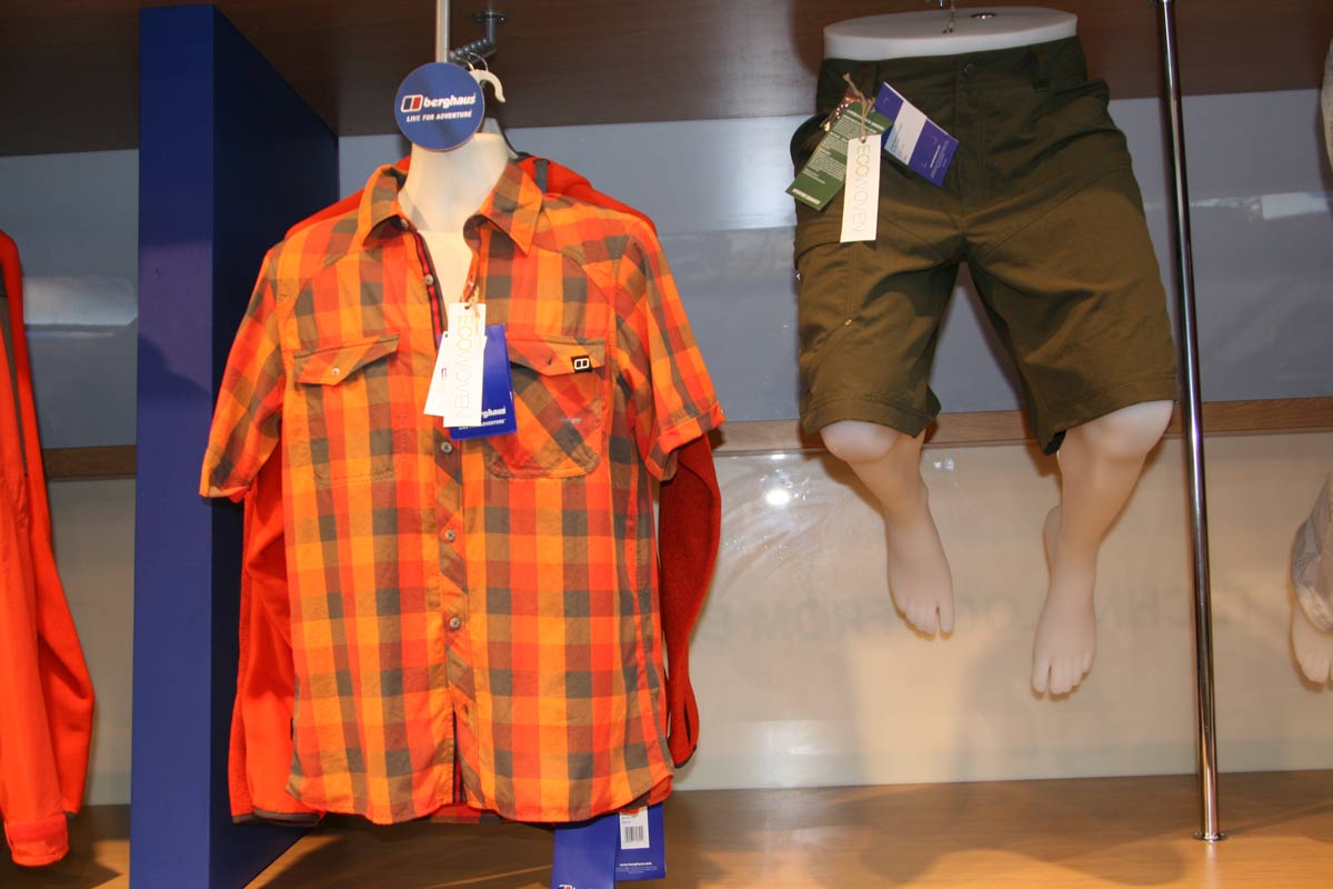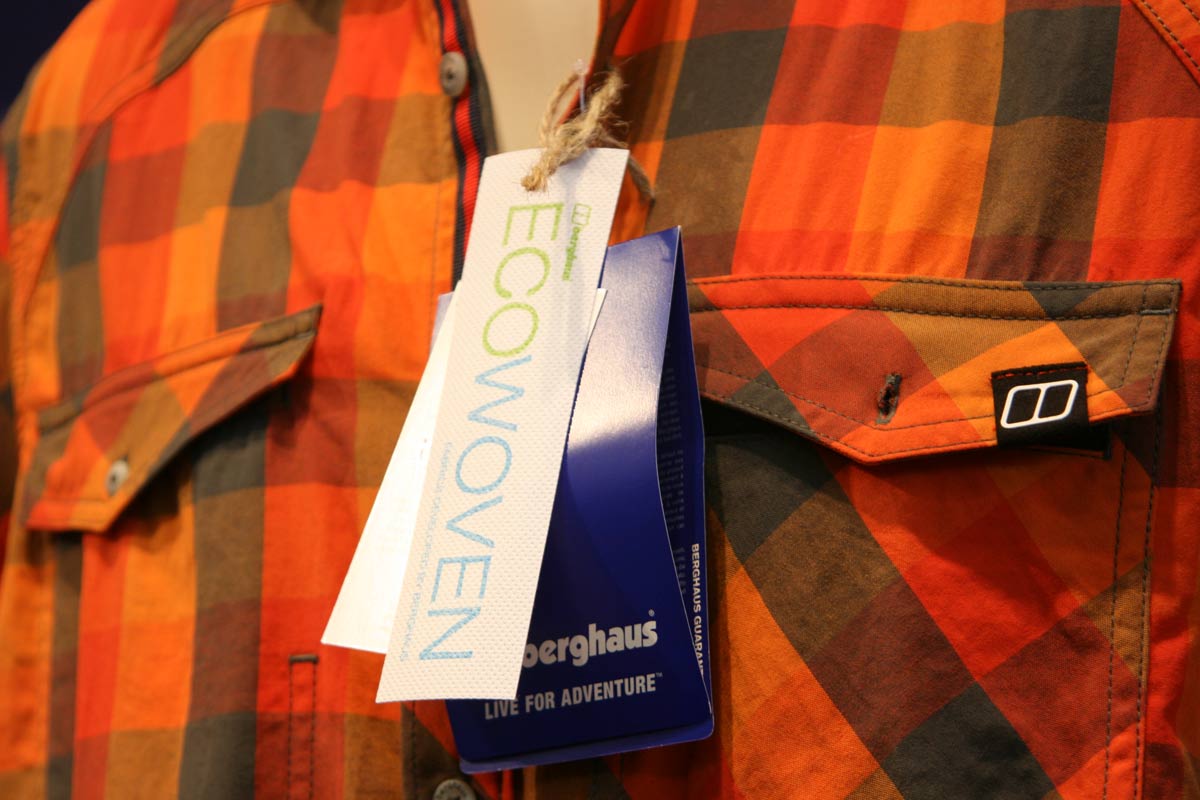 Last but not least, there were lots of orange – and other colours – checked shirts in evidence on the stand. Turns out that they’re part of the Berghaus ECO wovens programme. All the garments in the range are produced using a more eco-friendly dying process, which adds colour to the polymer melt before the extrusion process (it says here).