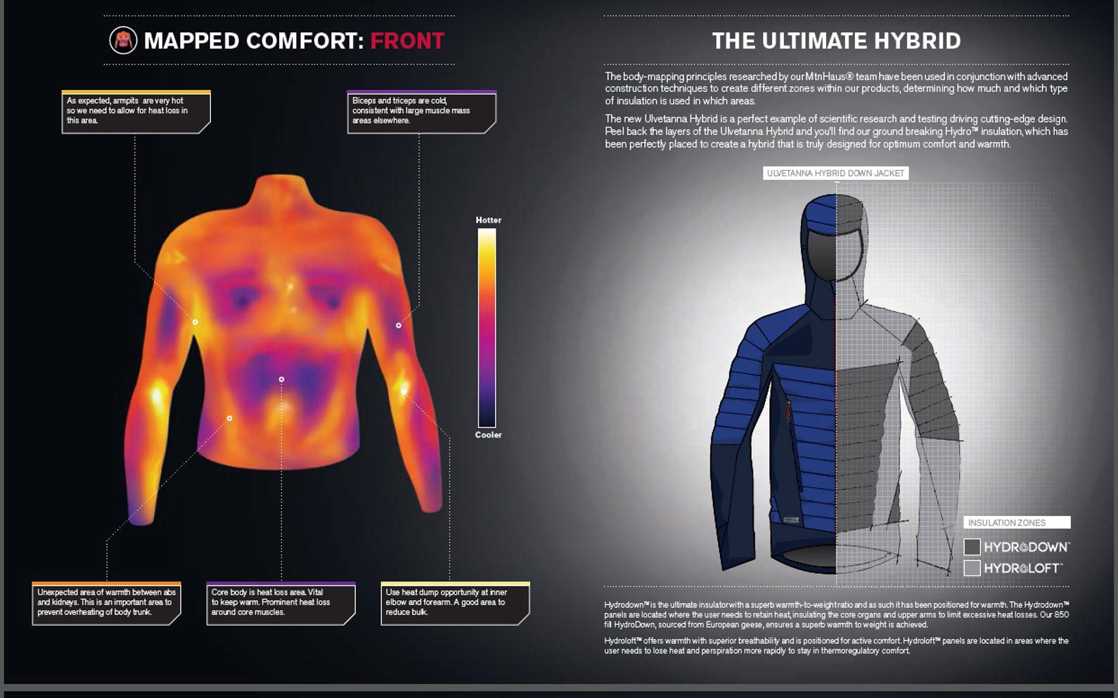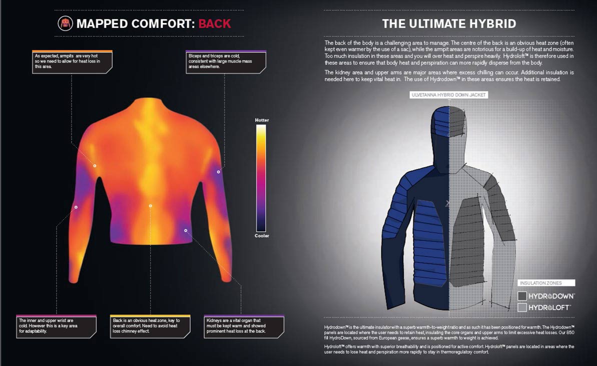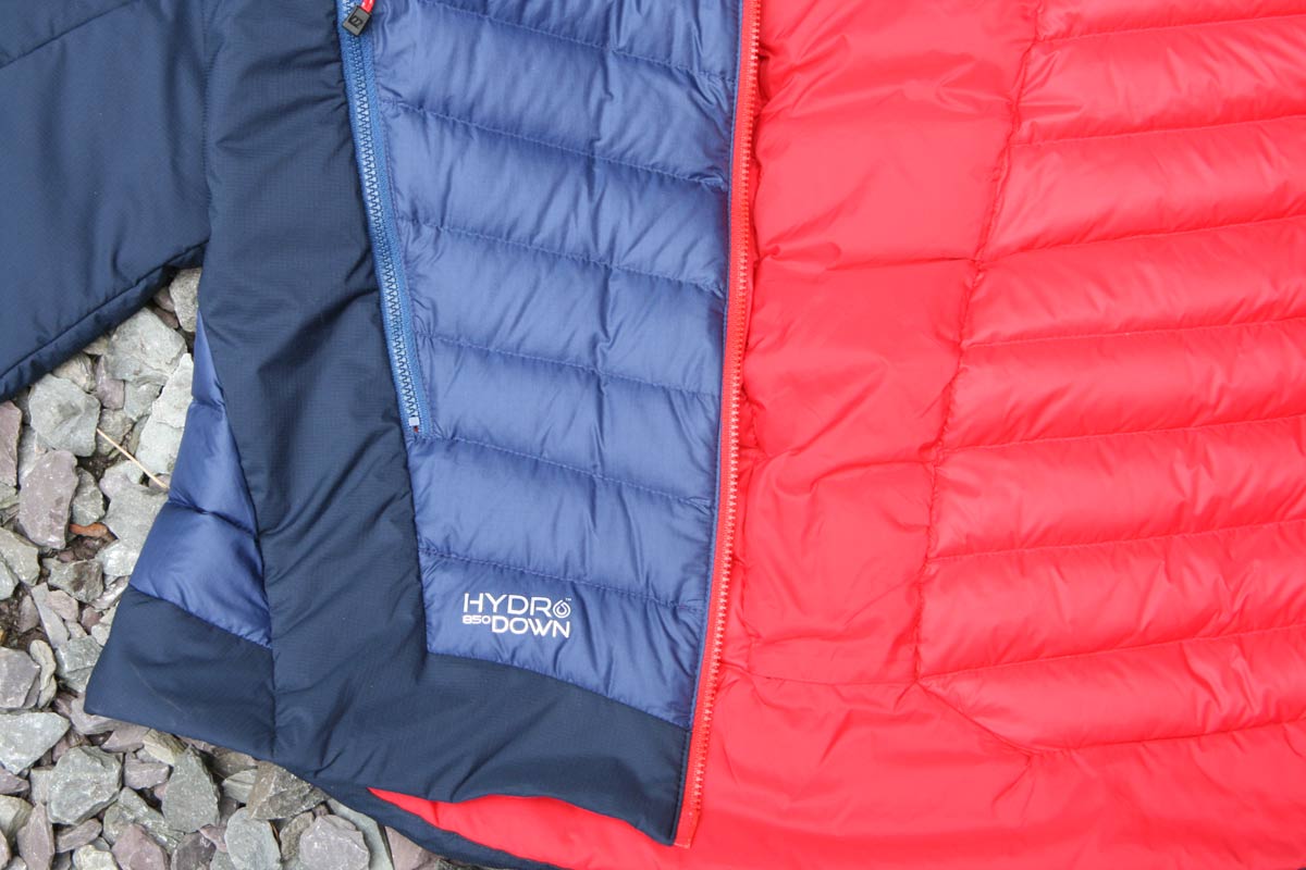 The idea in really simple terms, is that the warmer down goes over parts of the body which need most protection like the kidneys and abdominal core, while hot areas – the armpits are an obvious one – get the less warm but more breathable Hydroloft to help the body lose heat when working hard.