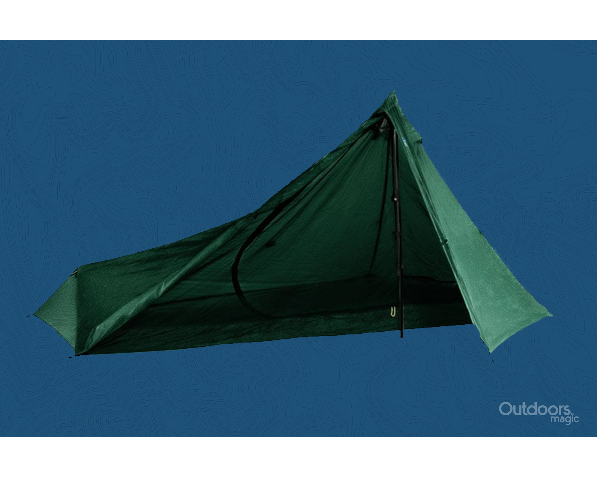 Pegs and guylines not supplied / packed size 20 x 14cm / SuprSil Ul flysheet with silicone on each side / no-see-um mesh netting / seam taped floor / 1 x aluminium 7.9mm 38cm foot end pole / interior pocket / top vent / large side door.