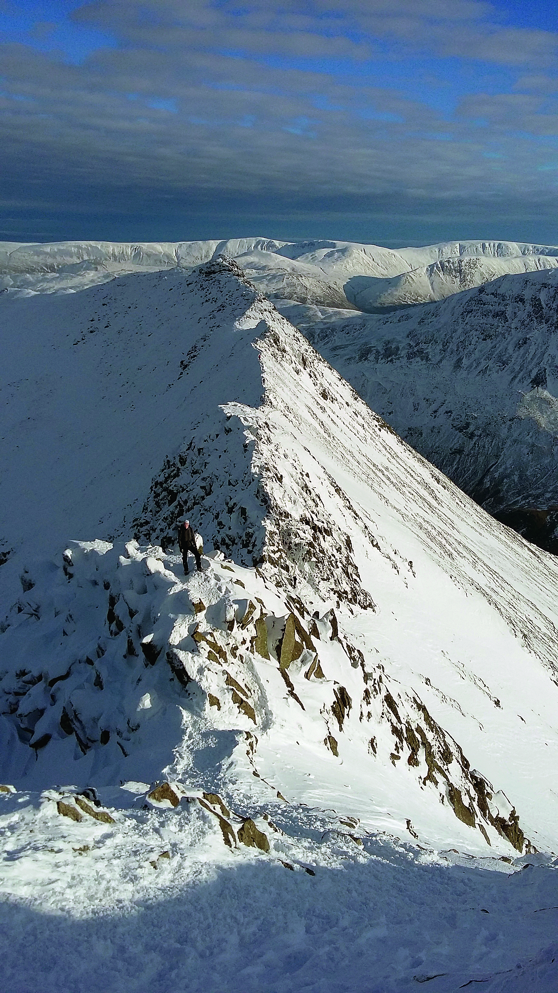 Stephen Goodwin: No single favourite. I take the days as they come. If I want a relatively short easy day then perhaps the hike over High Rigg, with just a hard frost on its undulating hillocks, its tiny tarns all frozen over and the surrounding higher peaks mantled in snow. That can be a beautiful outing. If my mood is for something wilder then I’ll probably head for one of the ridge routes out of Grisedale or a climb up Nethermost Gully, a chance to engage ice axes and crampons.