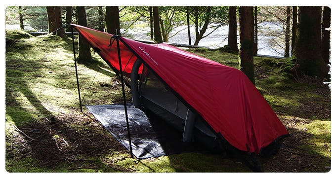 After that’s all up, you can then fix the heat reflecting flysheet over the top and this can then be propped up on either side to make for a kind of tarp system. The flysheet, being waterproof and supposedly super strong, can then also be used as a hammock.