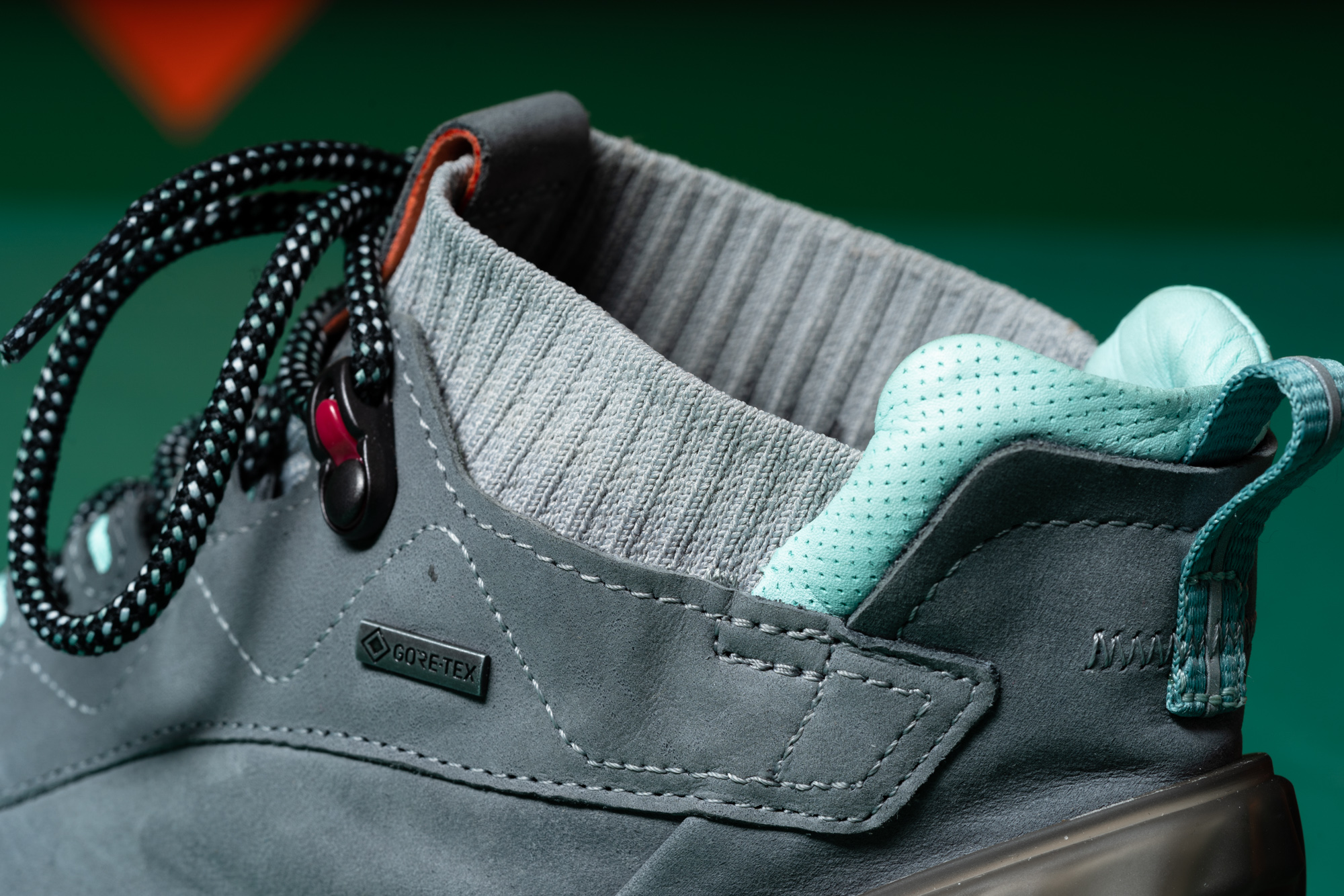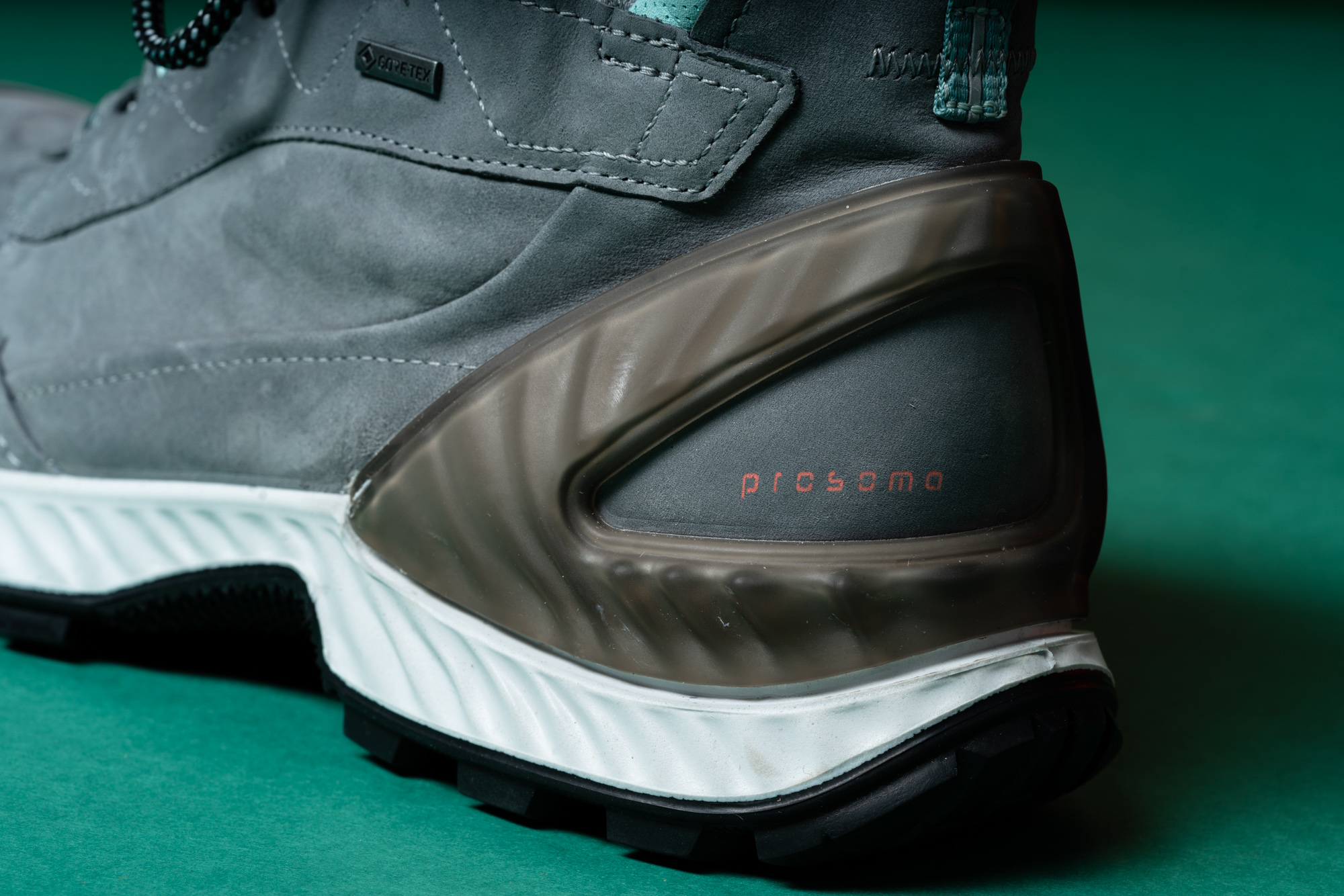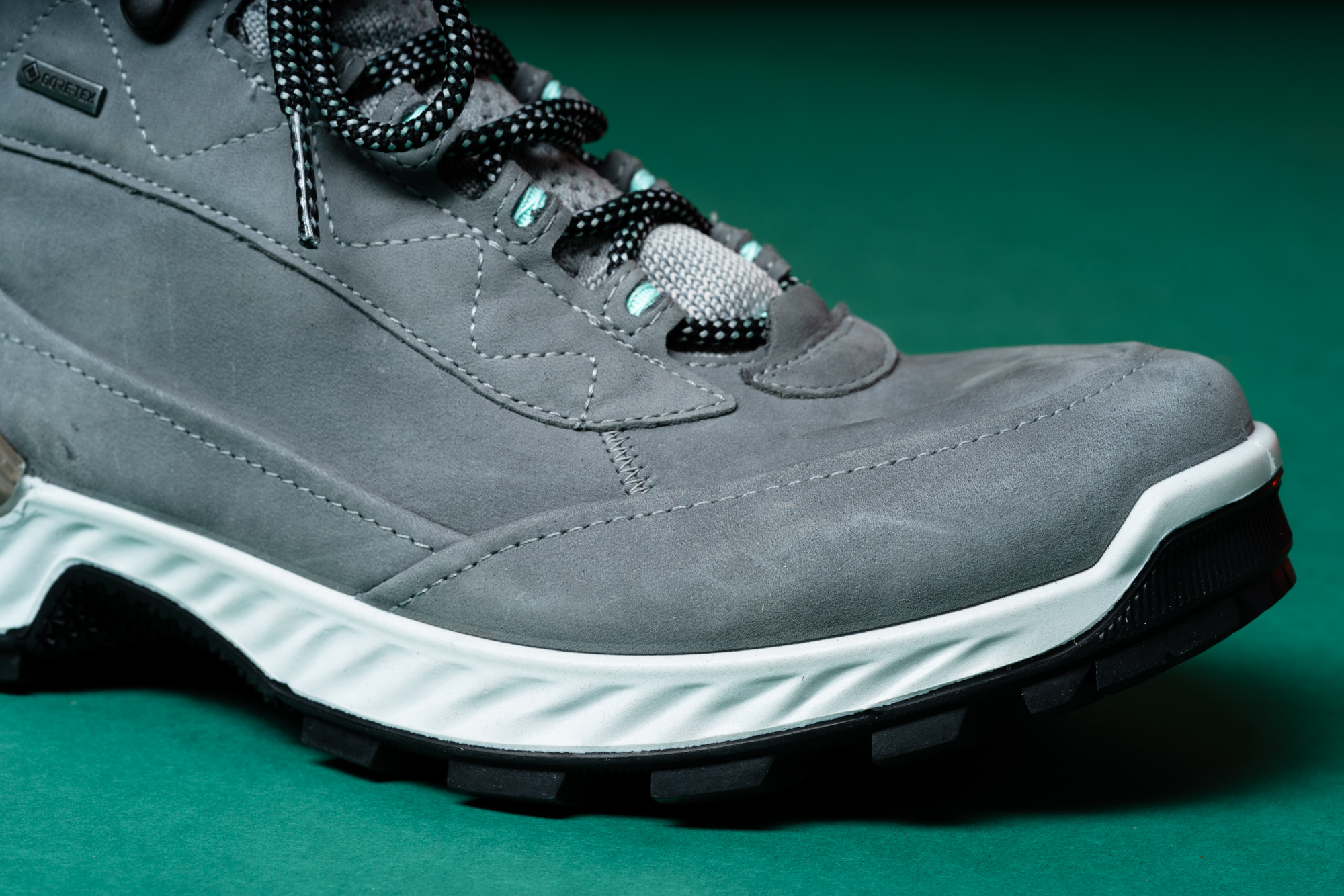 So what about the leather on the Exohike then? This, according, to Ecco has been tanned in a way that reduces the amount of water and chemicals that are required (by how much, we’re not sure). It’s got a very supple feel to it, in fact it’s some of the smoothest leather you’ll see on a walking boot. It still feels durable though – enough to cope with any big days in the hills. It is a shame, however, that there’s only a protective rand for the leather on the heel and not on the toes. We can see some damage being inflicted there eventually. Another potential concern we have is in the amount of stitching; there are a lot of overlapping panels here and therefore a lot of potential for things to start coming apart.