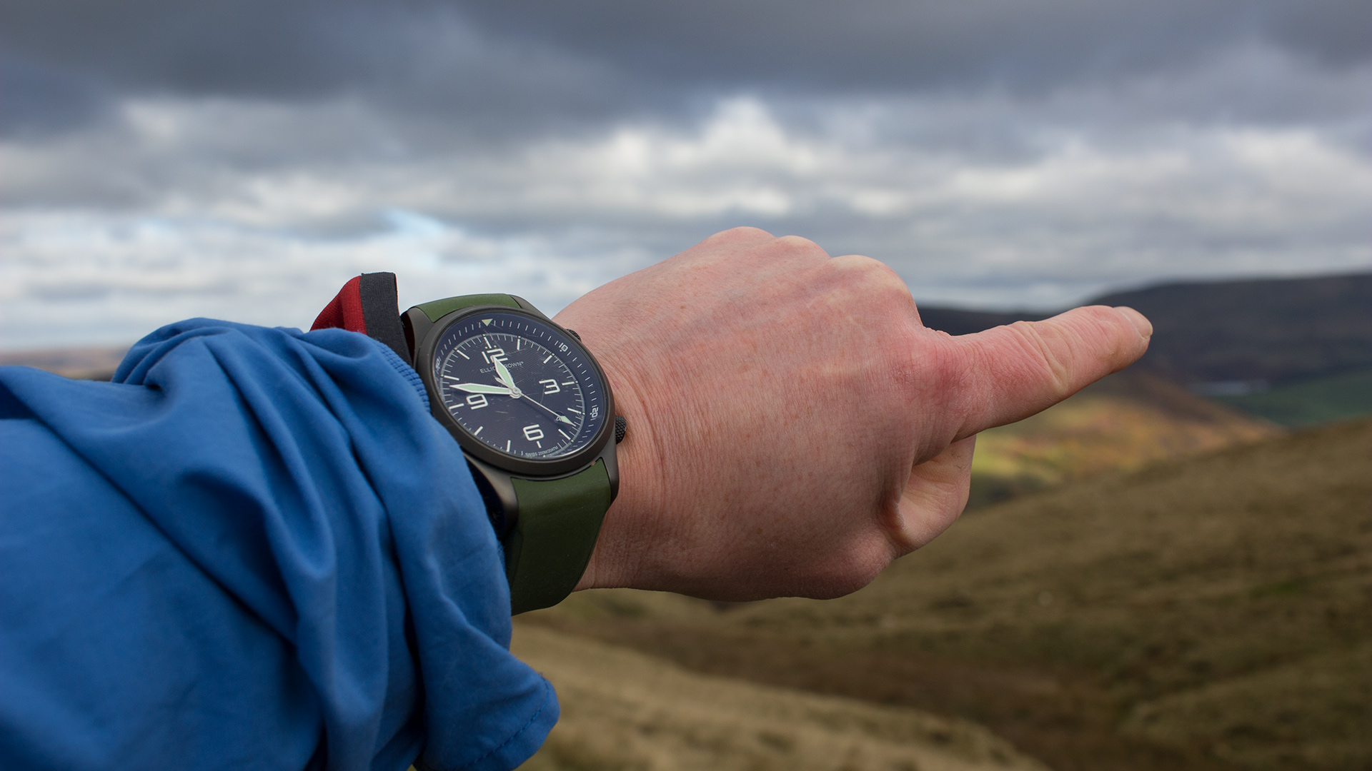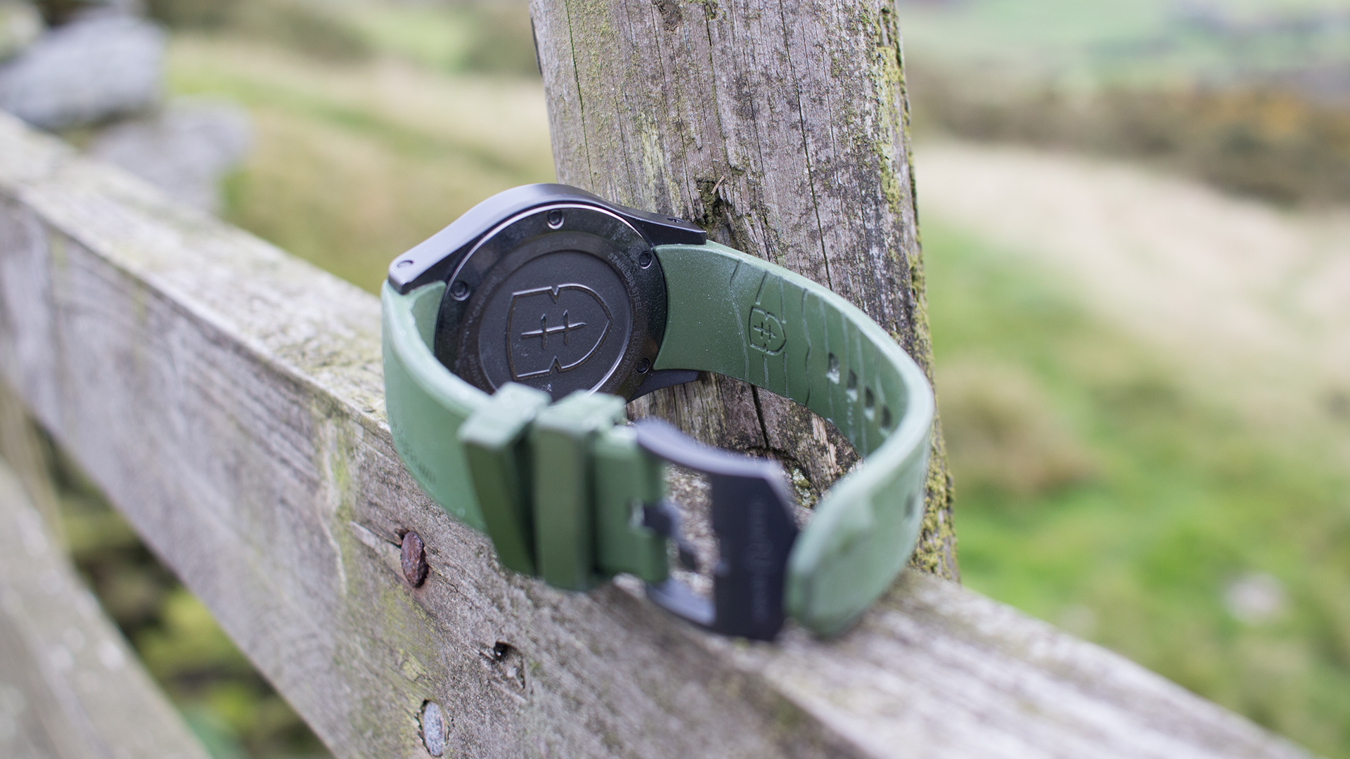 On the inside of the strap is moulded a set of contour lines from Tyneham Cap on the Isle of Purbeck, complete with spot height figures. They’re there not just for decoration, but to help the strap flex and stop water collecting.