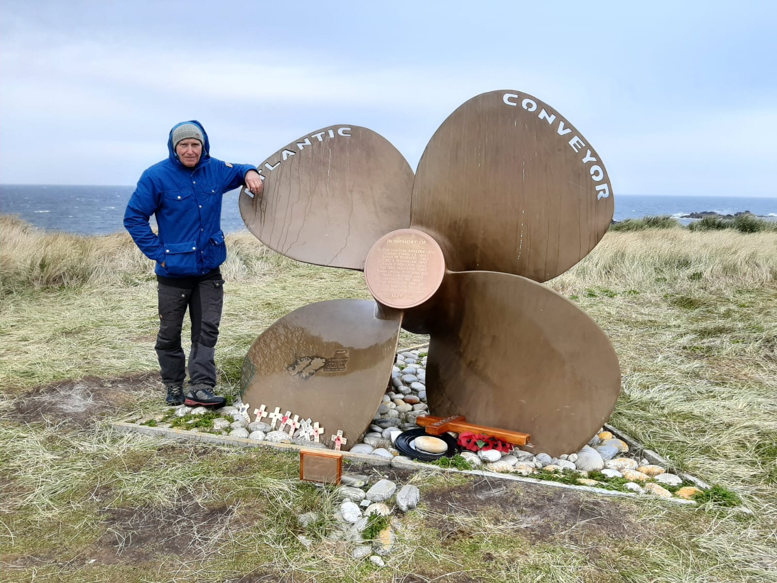 Alan alongside the memorial to the Atlantic Conveyor, a merchant ship sunk in 1982 by two Argentinian missiles.