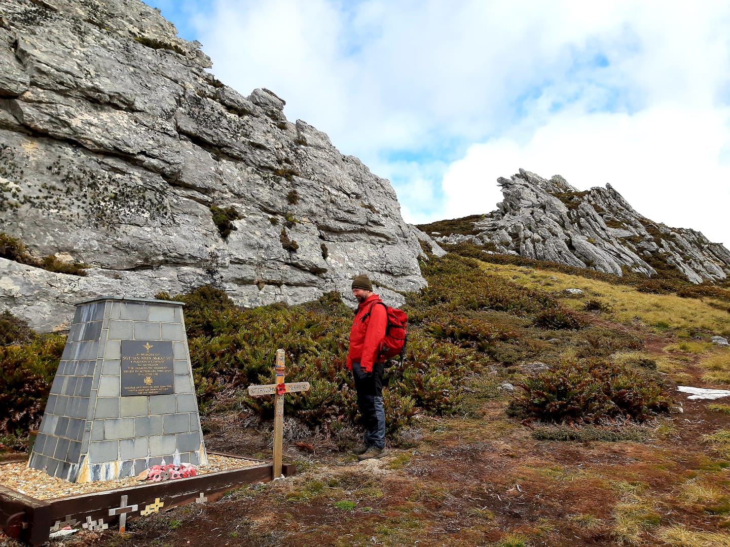 A 1982 war memorial below the rocky summit crest of Mount Longdon.