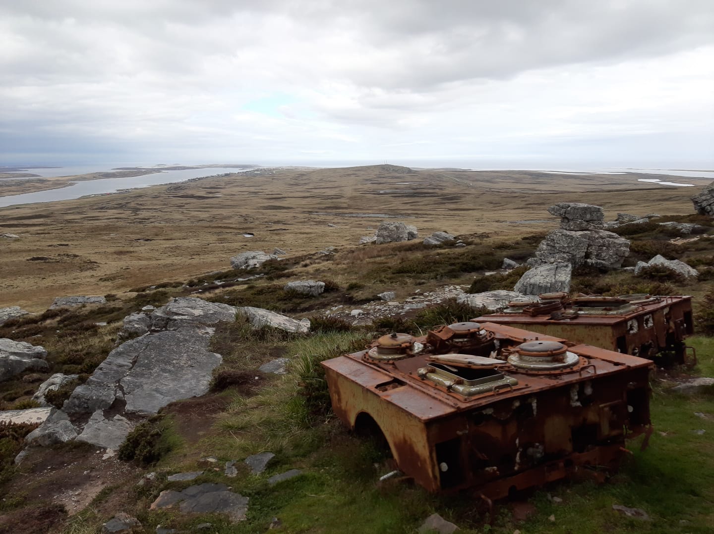 The well-known peaks from the 1982 war with Argentina, Tumbledown, Longdon, Harriet, Two Sisters, Wireless Ridge, William, Kent and Sapper Hill are all easily accessible from Stanley. They make interesting hillwalks in their own right, some like Mount William and Two Sisters have easy scrambles to the summit cairns/memorials and airy Striding Edge/Crib Goch like ridges. They are made more interesting with the battlefield history associated with them. Abandoned Argentinian equipment is still to be found on the hillsides, such as recoilless rifles, mobile field kitchens, 50mm machine gun emplacements, dugouts, shoes, blankets and sometimes some of our spent munitions. Thankfully the minefields have been cleared though some areas still remain cordoned off for now.