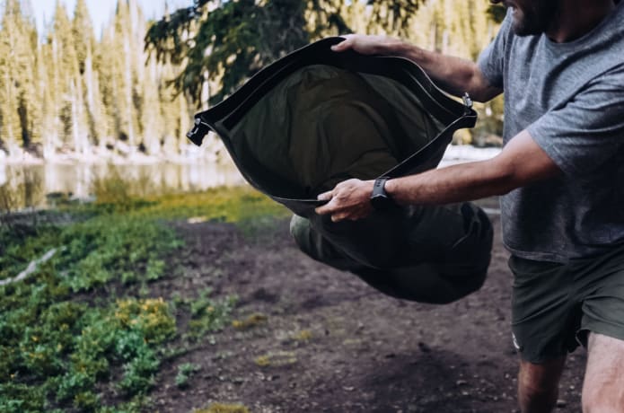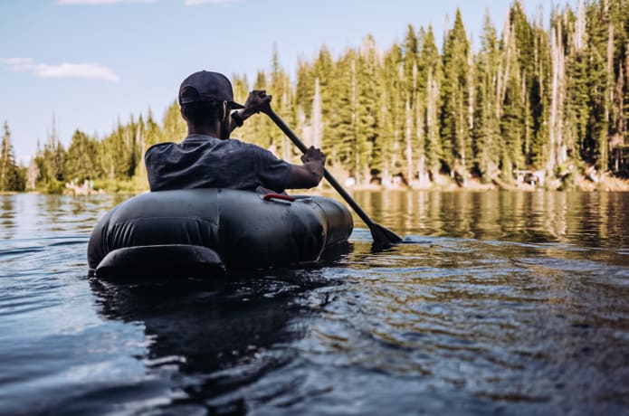 The packraft is made from a coated 400D polyurethane fabric and features welded and watertight seams. No pumps are needed to inflate it. All you need to do is open the roll-top closure and scoop air into it – like you would with those weird inflatable loungers you see on beaches – then you just give a final top up by blowing into the one-way valve.