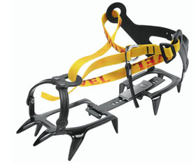 | Verdict: Near perfect lightweight steel walking crampon, though if you’re planning on any climbing you’ll want a more aggressive design with forward-orientated secondary points. The crampon itself is well up to general winter walking and adjusts easily while still compacting neatly for carrying. The binding system is excellent – tolerant of different boot shapes and exceptionally easy to use even with freezing fingers. Easy to release as well. If you have B1-graded boots, take a look at the double-cradle New Classic version as an effective alternative. The ten-point design is also ideal for those with smaller feet. Good crampon at a good price. |