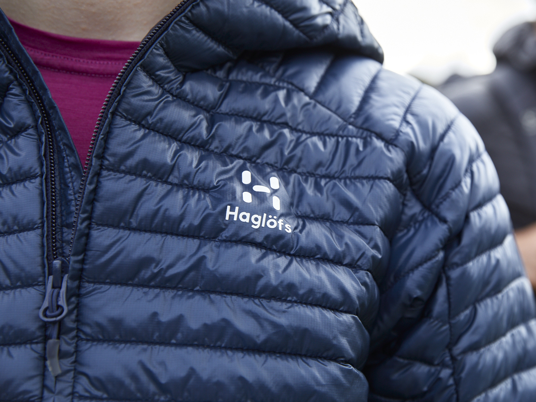 The fill Haglöfs have used here is called Mimic. It’s a mix of synthetic fibres that are designed to look like, feel like and perform like down, with the added benefit that they won’t lose their insulating properties when they get wet. These clusters are even blown into the jacket’s baffles following the same process used in down garment manufacture.
