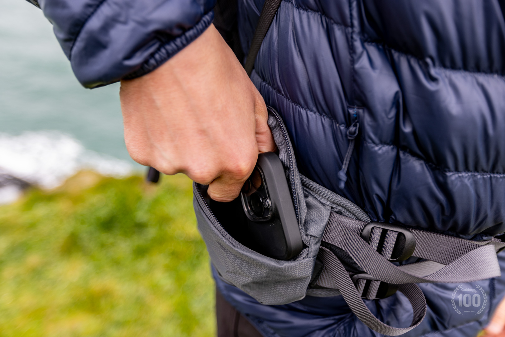 There are overlid and underlid zipped pockets, both of which are large – big enough for a lightweight waterproof jacket or a guidebook with space for extras too. The pockets on either side of the hipbelt are also quite large. They’re not big enough for an OS map but they’ll easily swallow a smartphone or a satellite transponder.