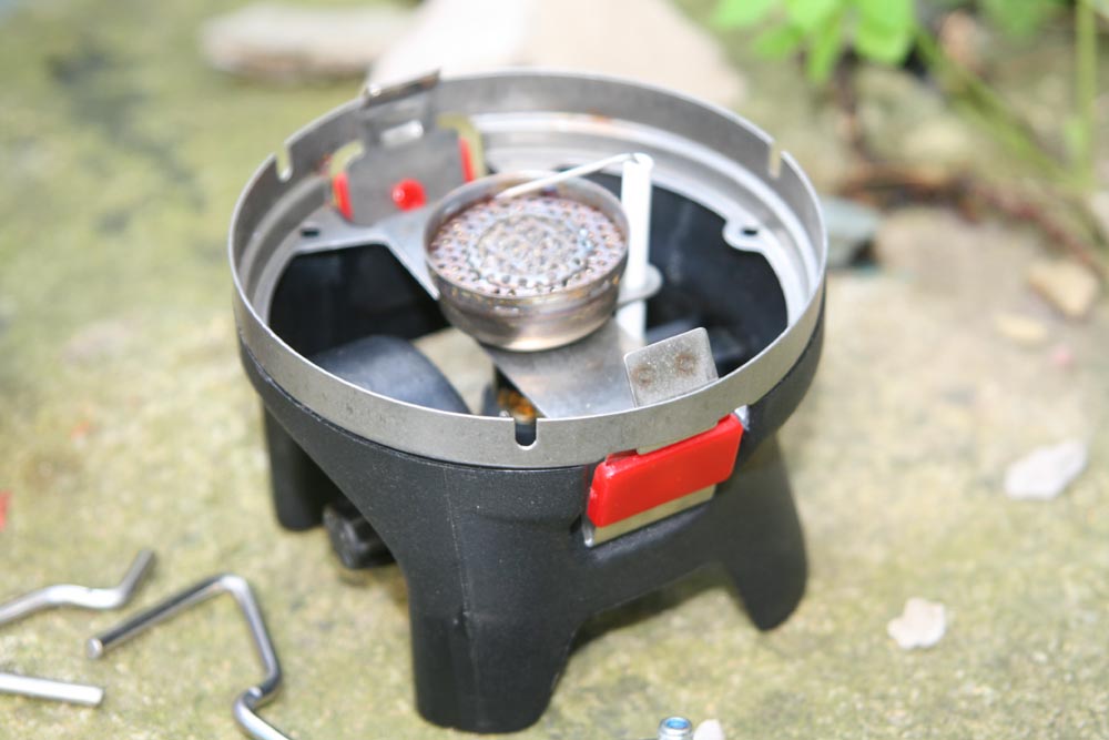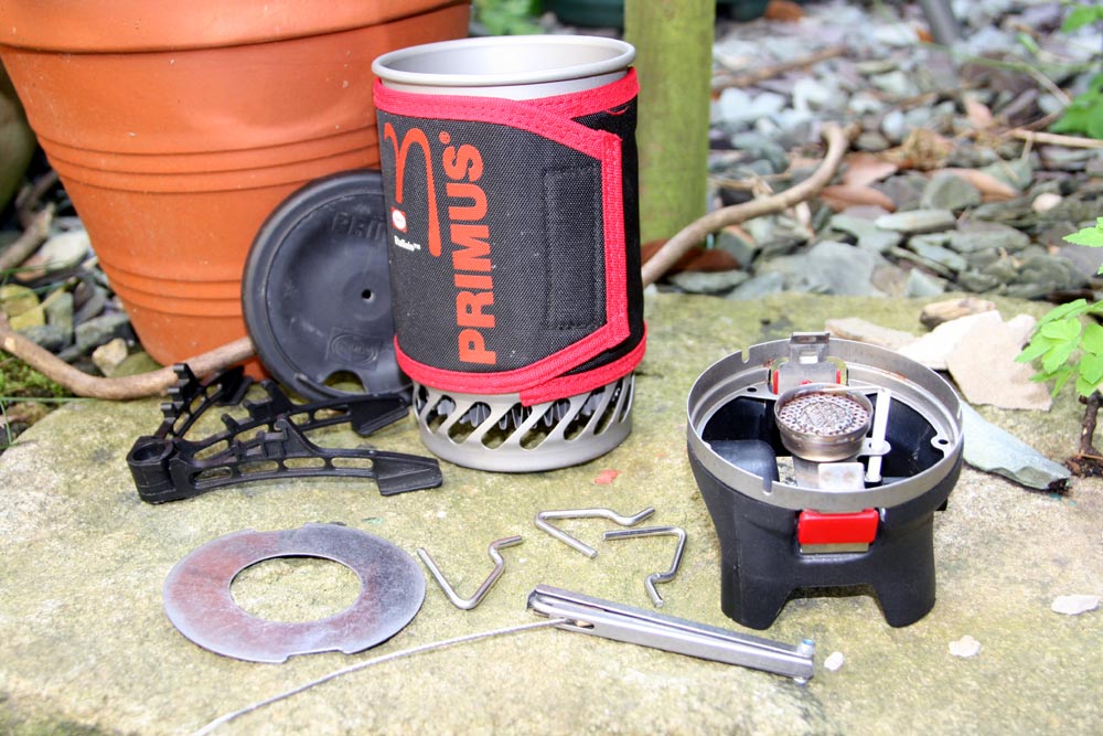 Take the pot adaptor for use if you want to use the burner unit with a normal stove. The JetBoil one is a single piece disc with fold-out, serrated pan supports that just clips onto the top of the burner. By contrast, the Primus solution is three bent metal prongs that sit in locating holes in the burner coupled with an additional metal disc. Just a bit fiddly and you can imagine simply losing one of the small pan-supporting rods in a moment of camp-breaking carelessness.