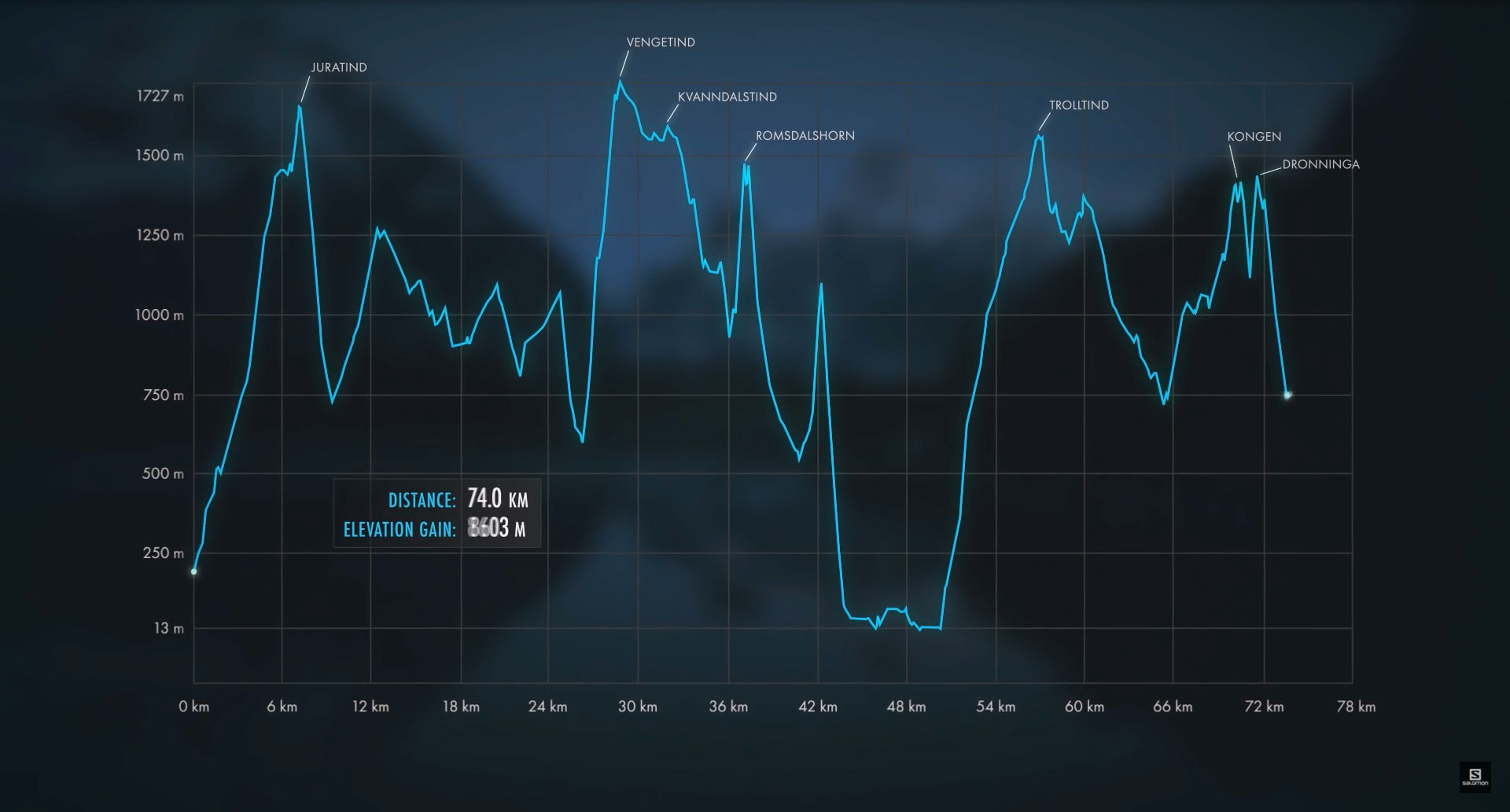 The local test piece is something called the Seven Summits of Romsdalen, a 77km route with 9000m of elevation gain. And Kilian being Kilian sets out to tackle it in single day linking the mountain sections with running and skiing the rest.