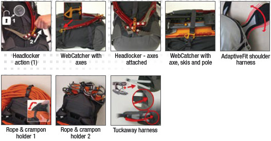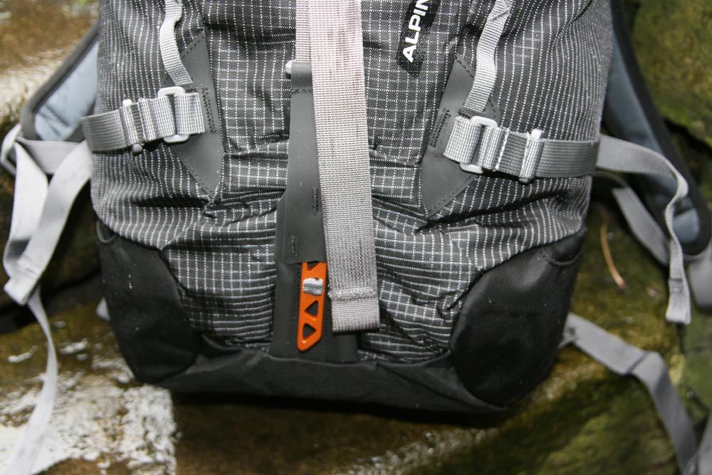 Headlocker sits at the base of the pack and threads through ice tool heads to locate modern climbing axes securely.