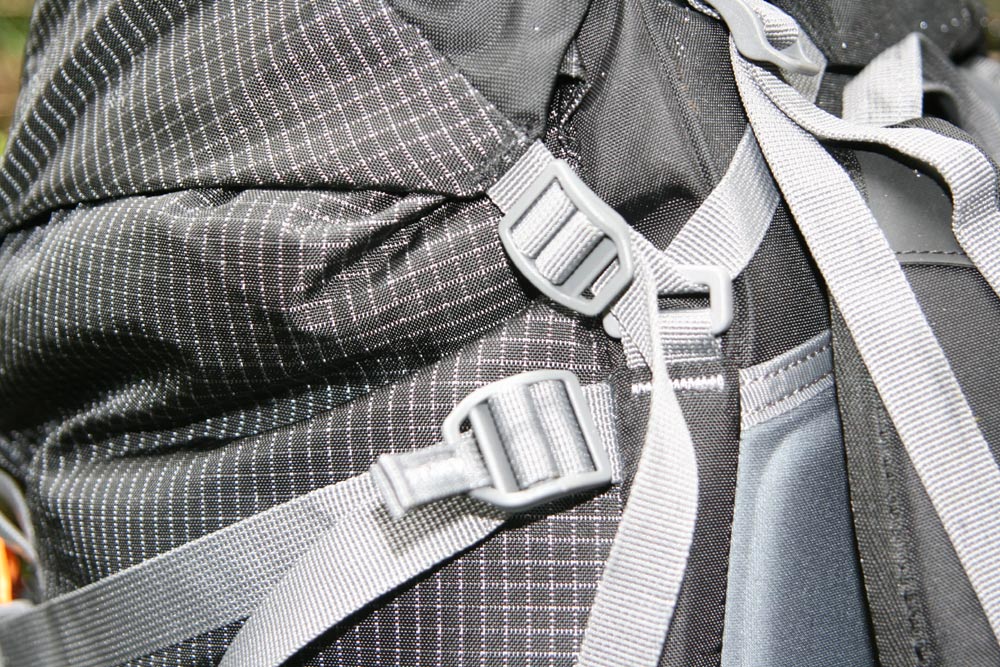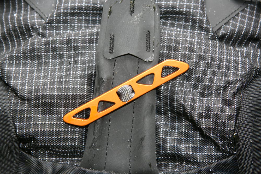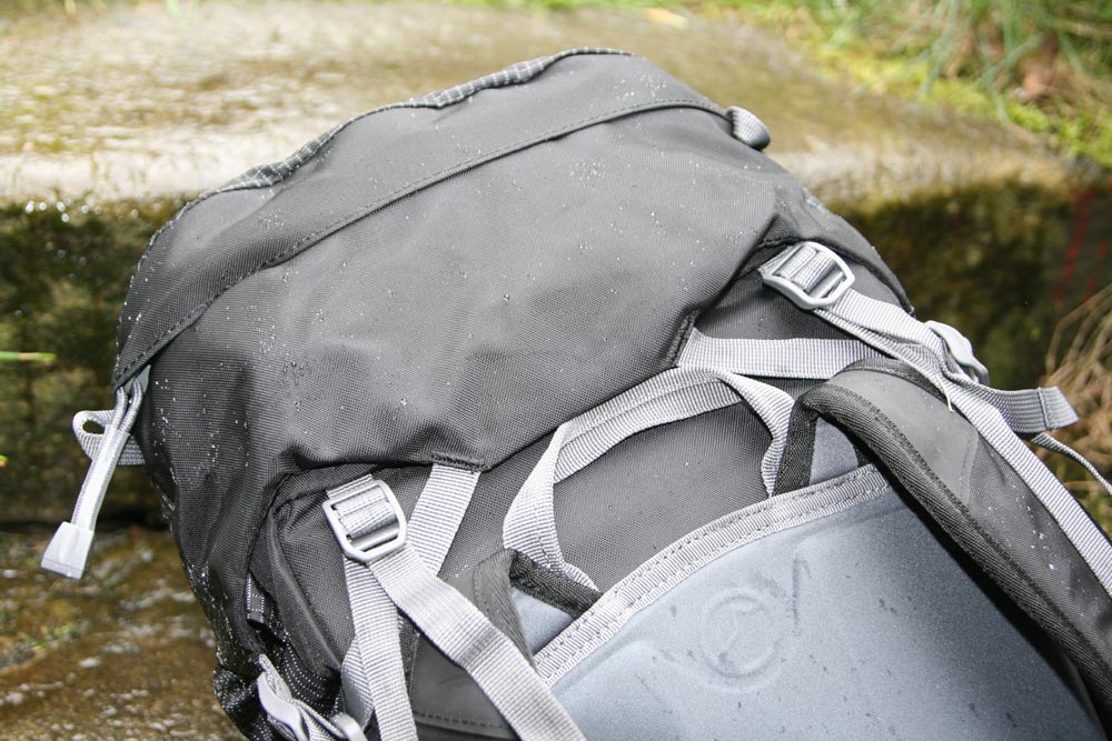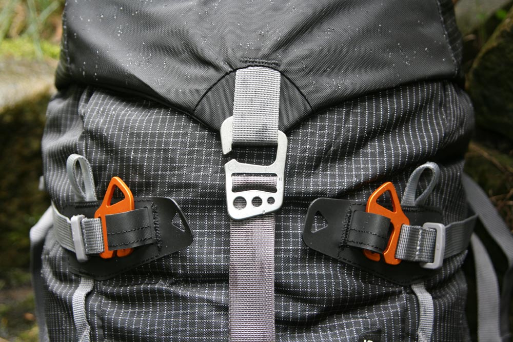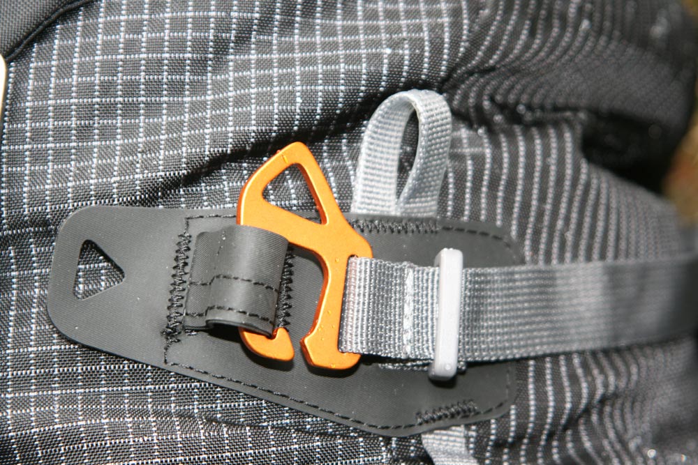 Also classic Lowe are the tough anodised, glove-friendly, alloy buckles – the ‘Loadlocker’ which holds the single main strap in place and the ‘Webcatcher’ which does the same for the side compression straps. Nice to look at, but also very effective particularly if you’re wearing winter gloves.