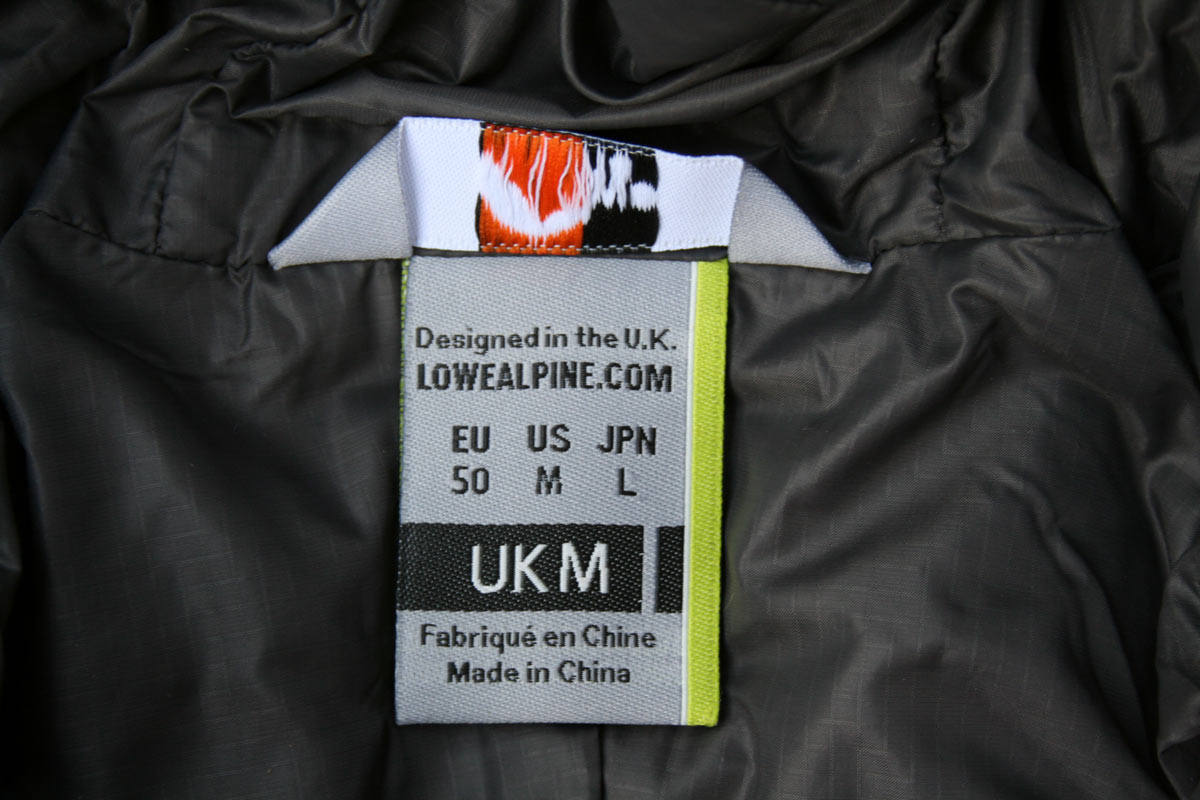 The rest of the spec is unfussy and effective – there are two hand-warmer pockets, an outside and inside zipped chest pocket, elasticated cuffs and an adjustable helm. There’s a – slightly narrow – baffle behind the YKK main-zip and it’s nice to see Lowe Alpine stressing its ‘Designed in the UK’ pedigree on the care label. No more Italian fussery here.