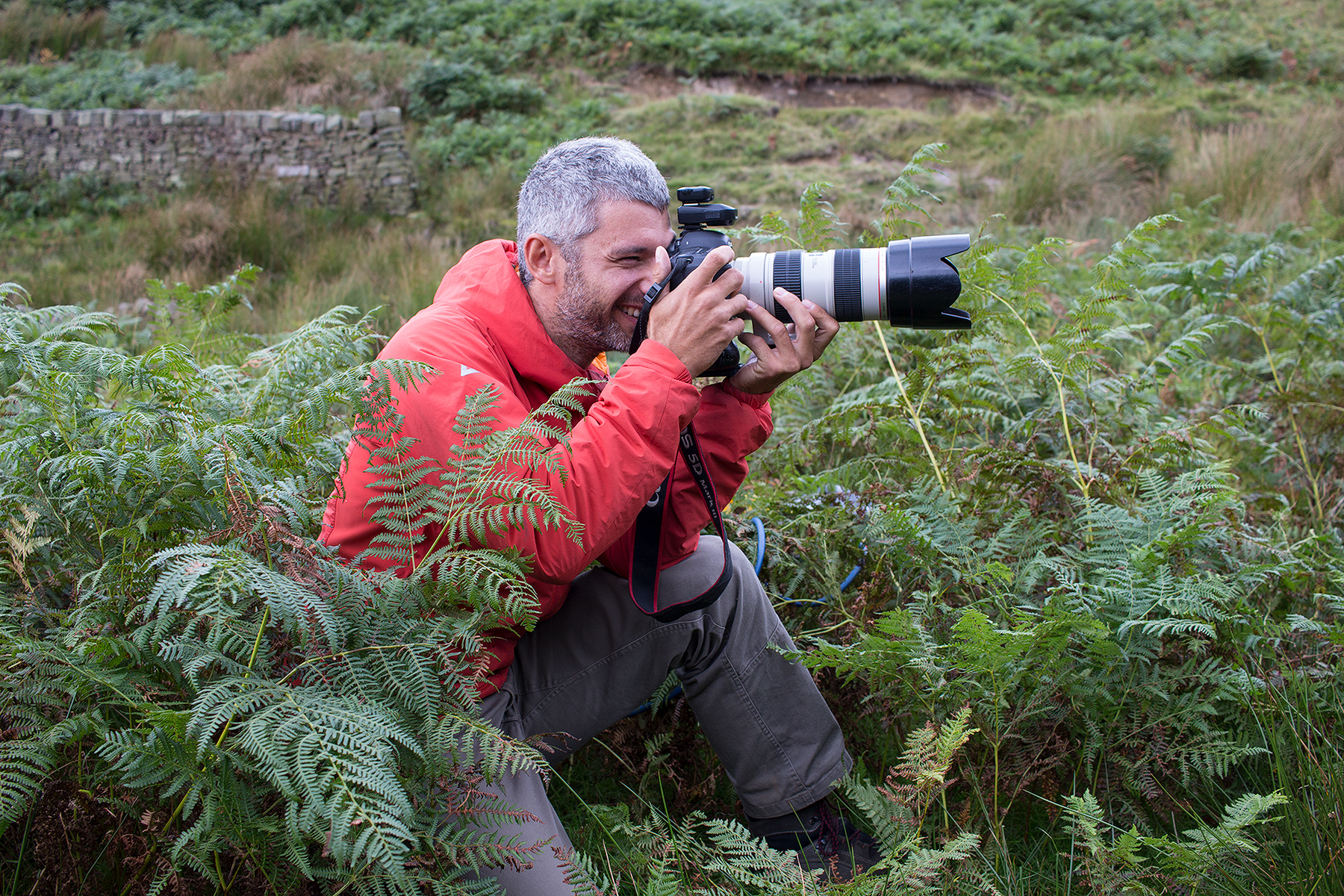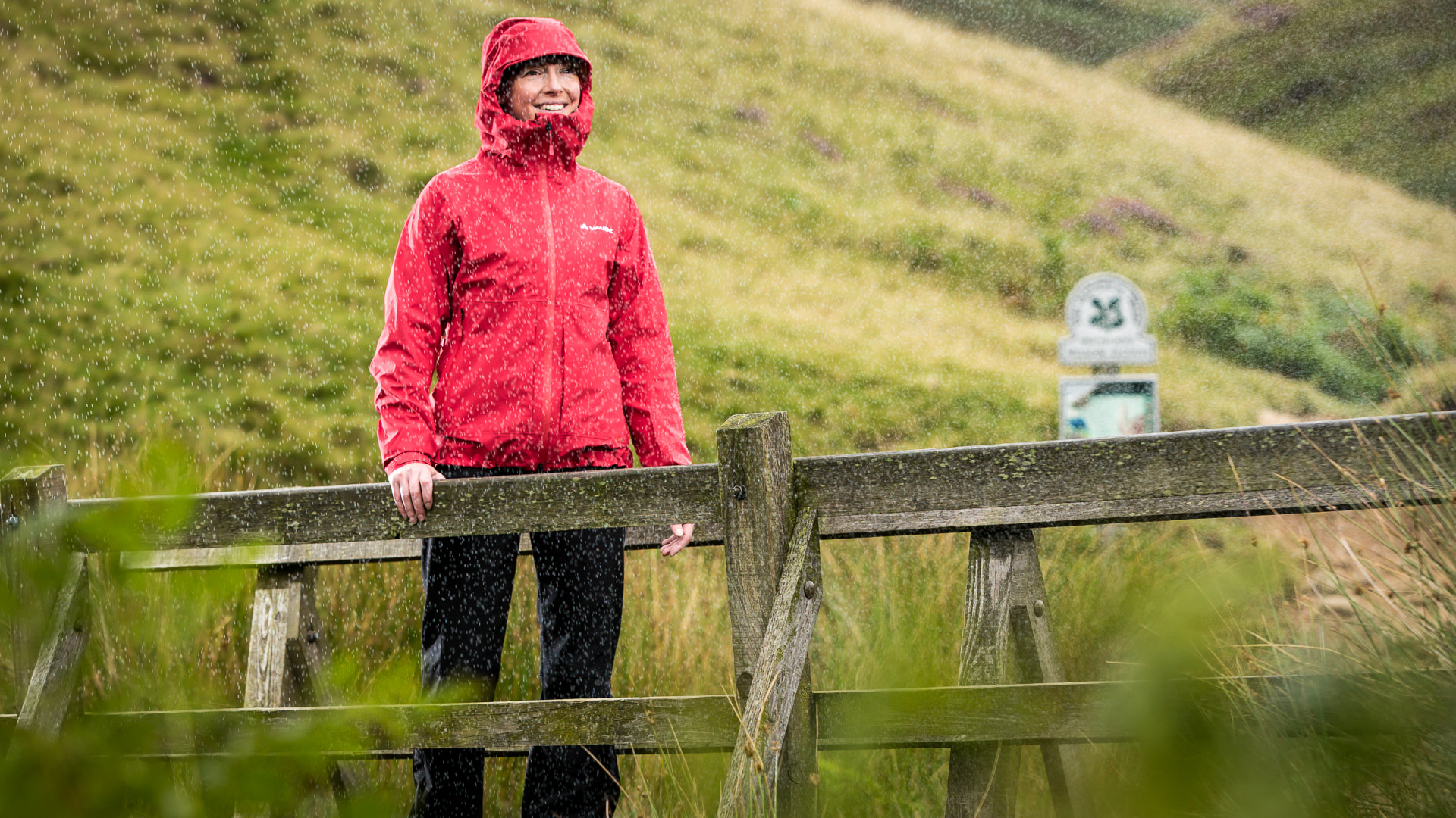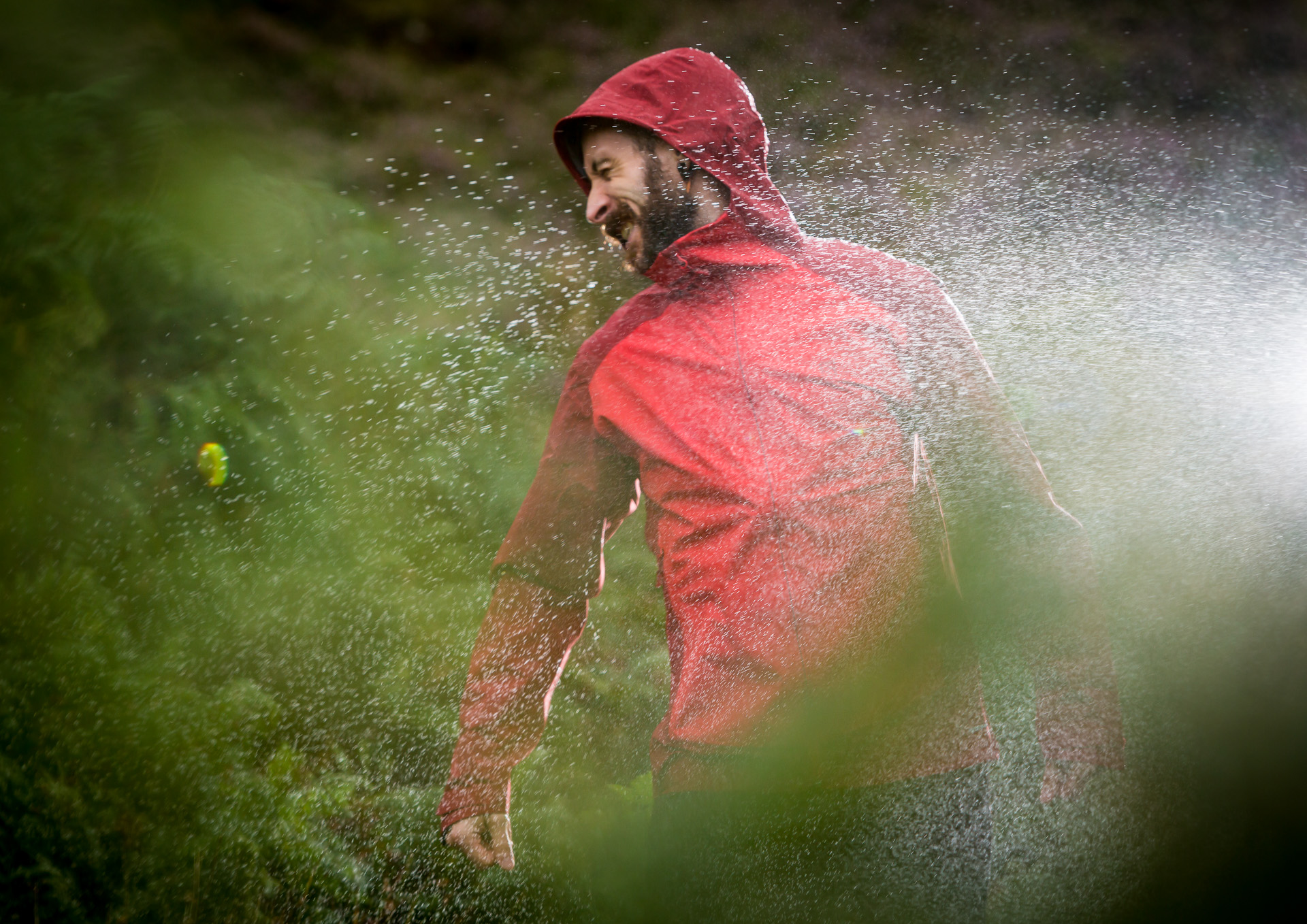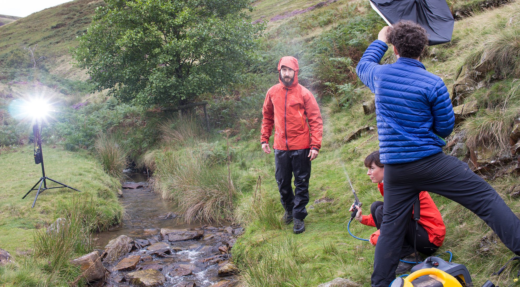 Once there, we set up our very own outdoors rain room in the midst of the sheep and the tussocks and the moors. Remote Speedlite flashes and diffusers optimised the light.