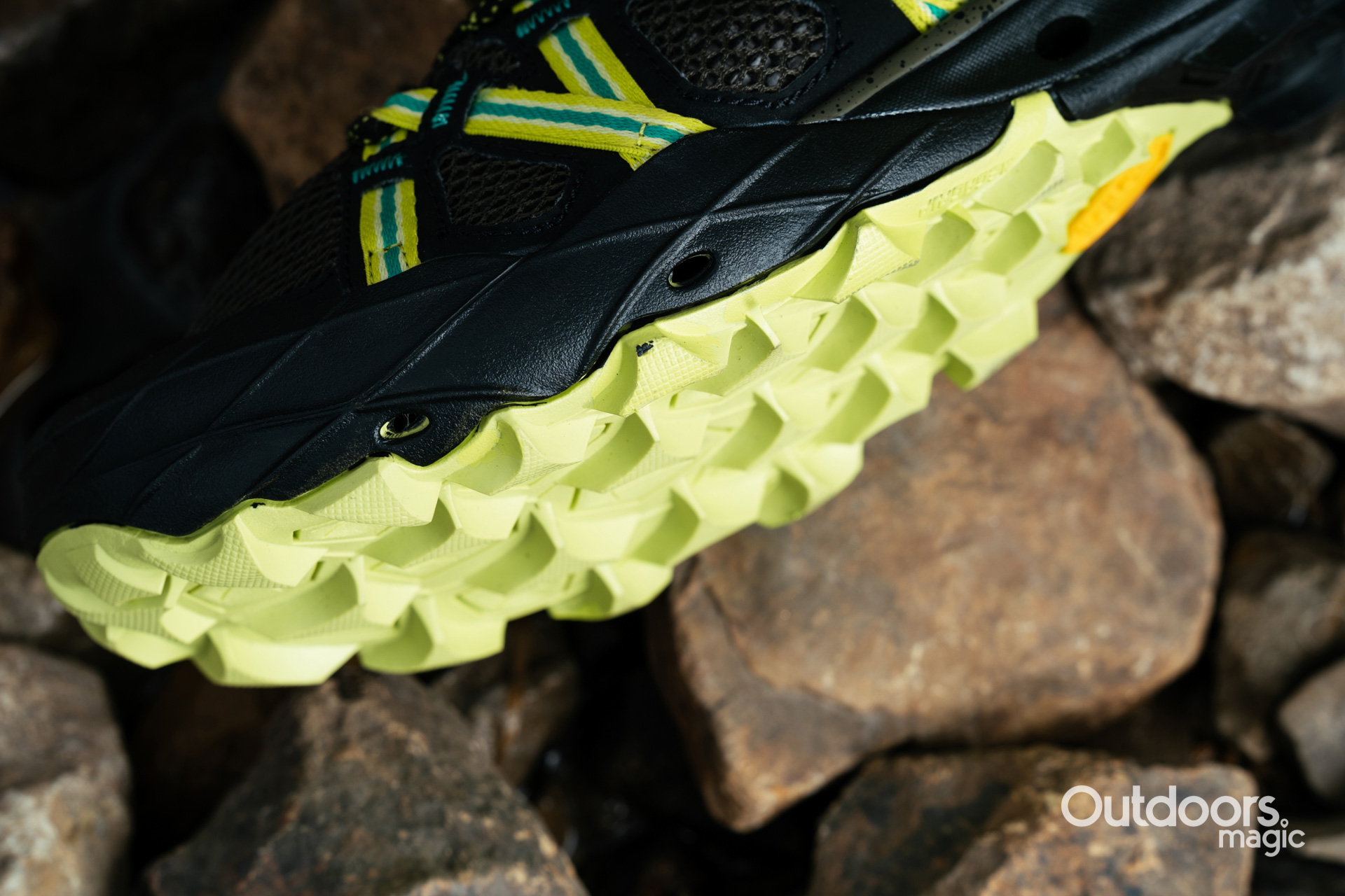 When you’re hiking through water, as well as needing good drainage, you’re also going to need protection, because the risk of slipping on wet rocks or stubbing your toe on them is obviously very high. Fortunately, the Choprock has you covered there. There’s that oversized toe bumper, which is solid enough to protect you, then there’s the grip, which features a Vibram Megagrip compound and 5mm multi-directional lugs. This outsole is actually very similar to the one you’d find on a number of Merrell’s mountain running shoes, including the Allout Crush.