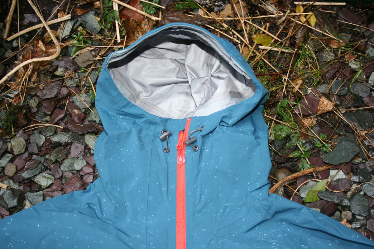 What makes it a walking jacket? It’s cut longer than climbing shells giving pretty much full crotch coverage, but without interfering with walking movement. That in turn means it has a waist as well as a hem shock cord adjuster and up top there’s a helmet-compatible hood which cinches down nicely for non-helmet use.