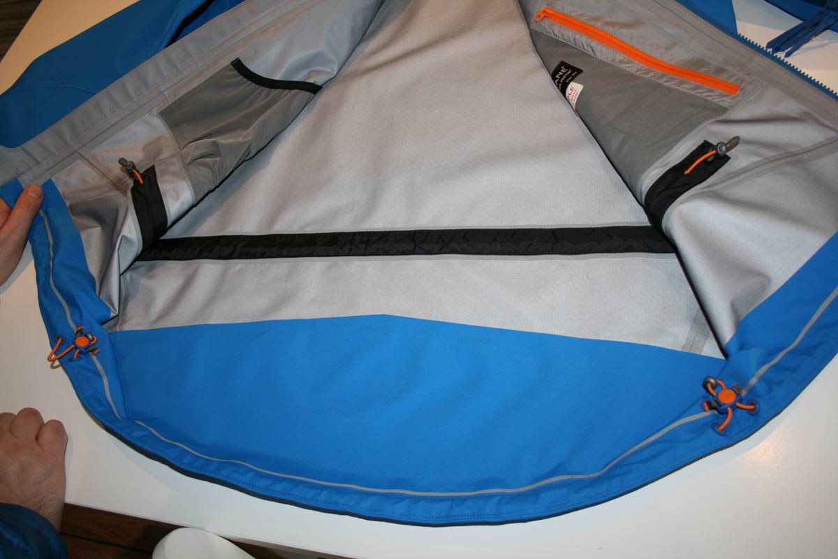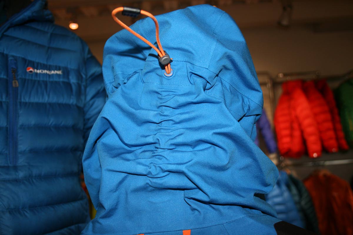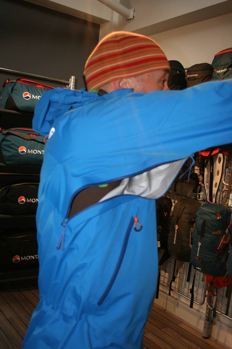 The cut is impressive. Plenty of room for shoulders and biceps – climbers apparently have those – but with a neat torso fit and a slim waist and practically medium-long. Overall weight is a very reasonable 606g claimed, about right for a fully-loaded technical shell. Price will be £300.