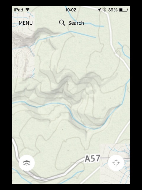 As downloaded, the app provides a choice between a ‘standard map’ – basic outline mapping complete with street names, and some contours, but without rights of way or the detailed terrain information that makes Ordnance Survey maps so effective or an aerial photography view. Both these need a data connection to download.