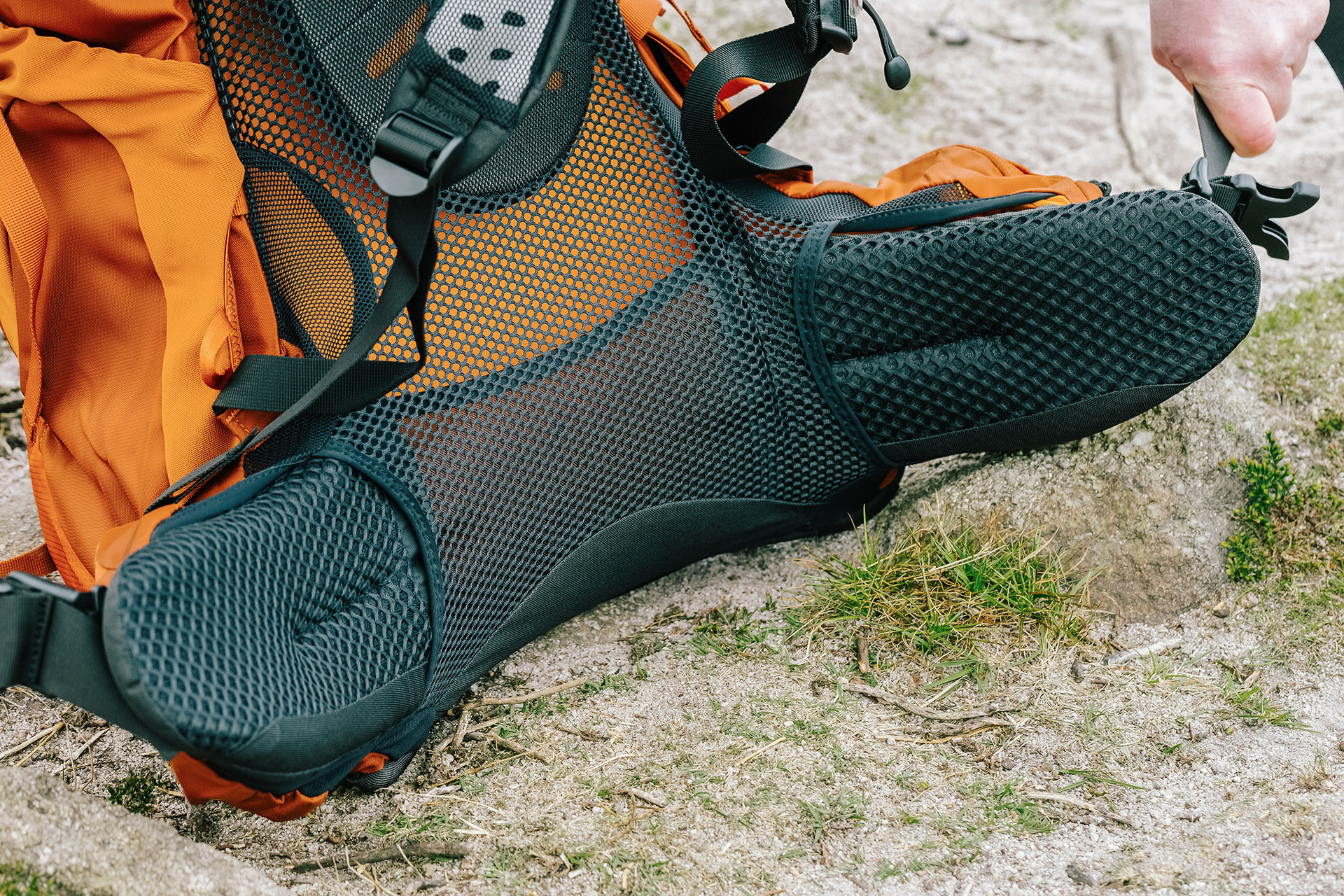 The sprung mesh lumbar area meanwhile, combines with the stiff load bars that are integrated into the harness. What this nifty bit of design does is transfer weight through the largest muscle groups in your legs, enhancing the backpacking experience and making it a hell of a lot more comfortable. When our test team loaded this up and scrambled around the Peak District, they were impressed with how well the weight was distributed and how easy it was to climb up steep hills even with heavy loads.