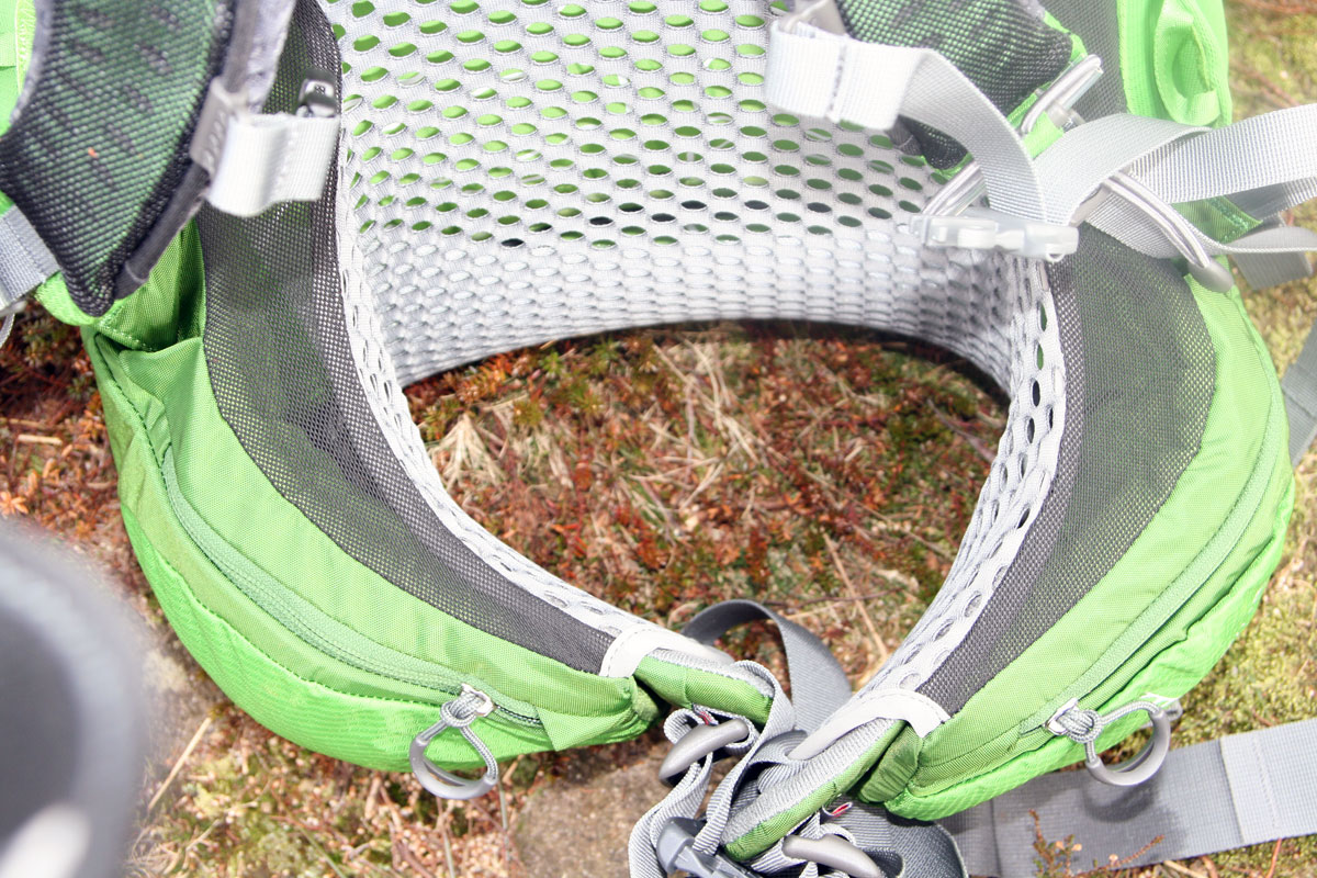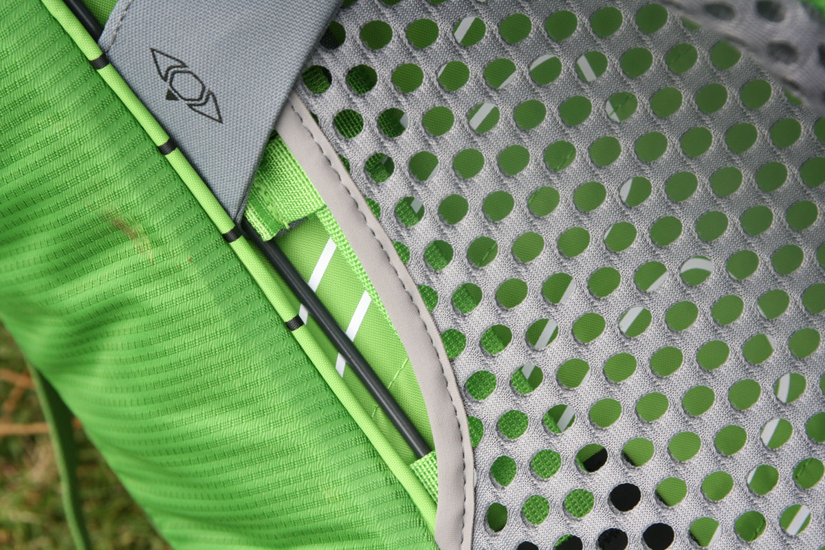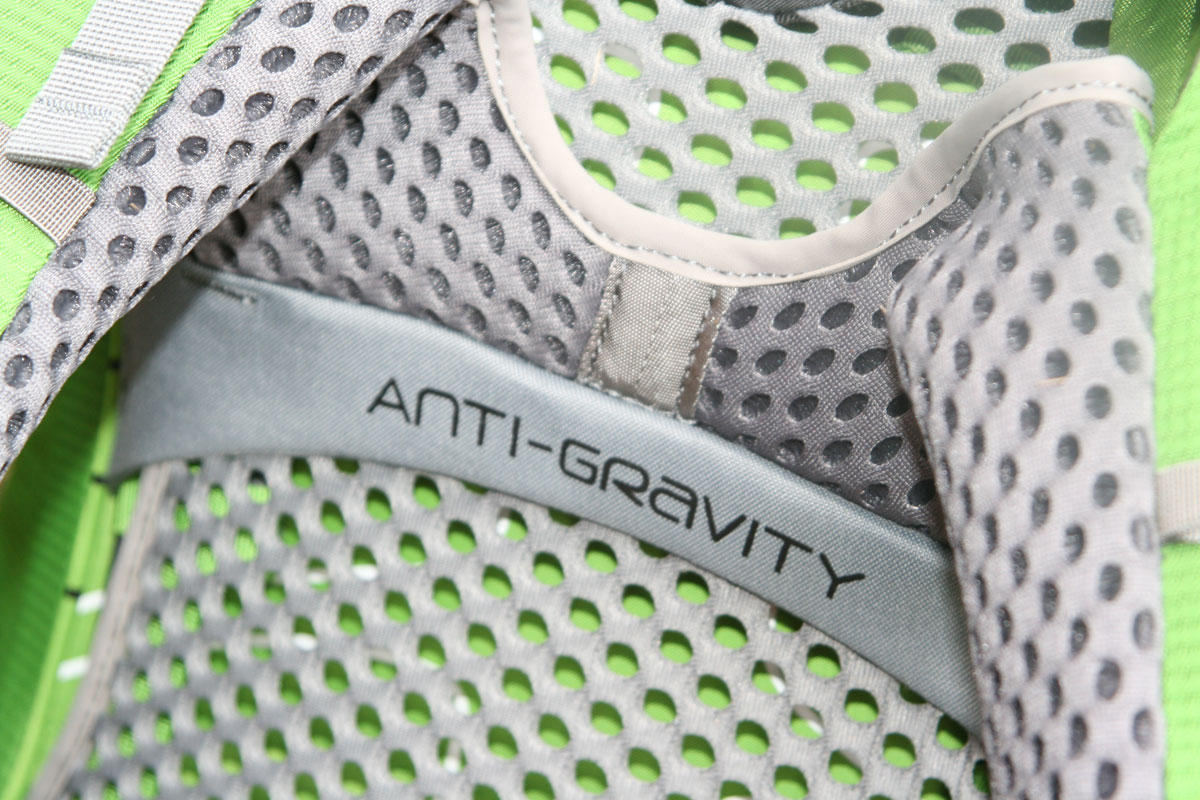 Mesh and lots of it! The Anti Gravity back system is like a vented trampoline-type affair but on steroids. Effectively a tensioned mesh panel sits over a 3D cavity – we guess it would be 3D – and against your back, but it also continues on into the fins of the hip-belt meaning that too is vented with an air-gap between belt foam and body.