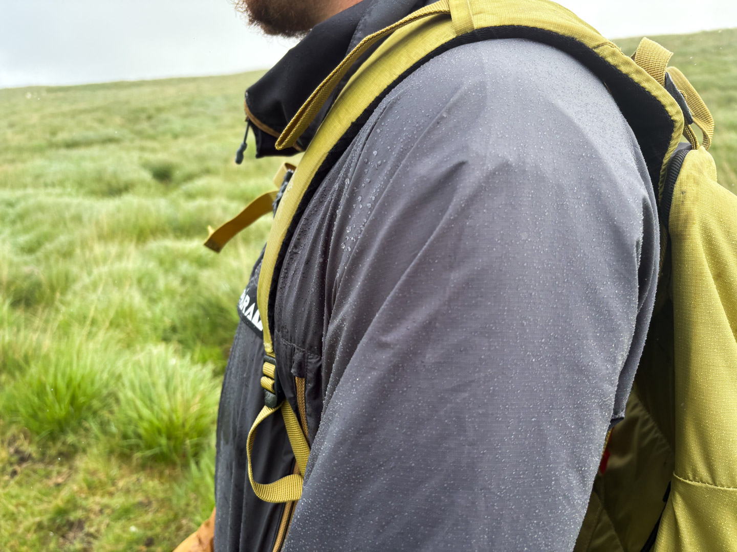 While this system is designed only for windproofing, I’ve found that the two layers cope well with light rain. You do start to feel some saturation in heavy and persistent rain however. Fortunately, while the fabrics can become saturated, they also dry noticeably quickly. On one occasion, while wearing the system in the Cambrian Mountains, I got pretty heavily soaked in a downpour that lasted about an hour. After that spell, the rain stopped, and within 30 minutes I felt bone dry again. That’s because the two layers are not only breathable but also highly wicking – they’re constantly working to spread out moisture thinly so that it can evaporate into the atmosphere more quickly.