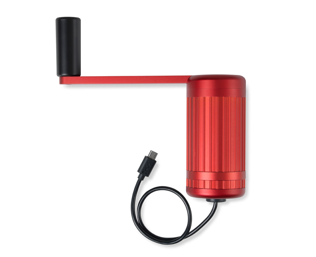 From the outside it looks like a hand-cranked version of the Powertraveller Powermonkey Extreme, but there’s no battery inside. Instead the inside is filled with a selection of gears, a rotor assembly and cunning electronics that convert your arm-power into handy electrical juice.