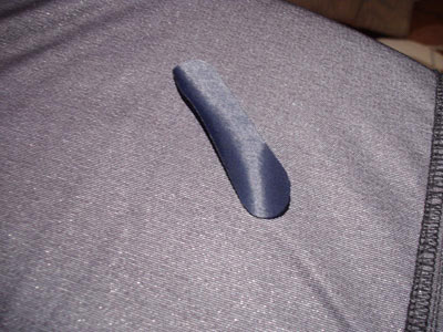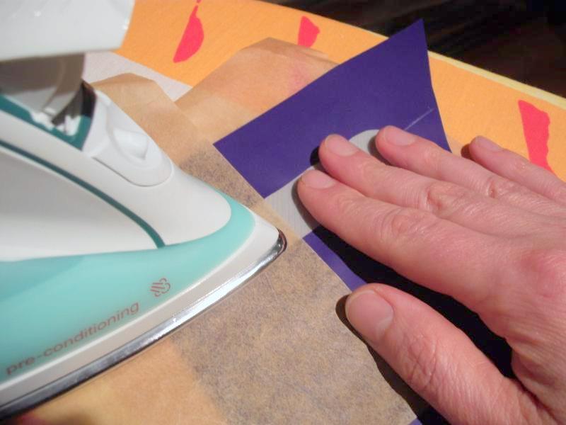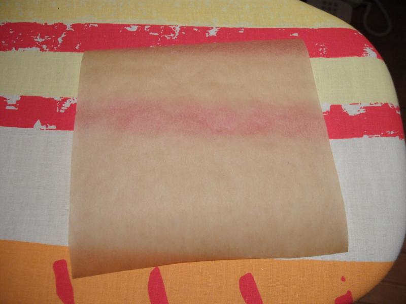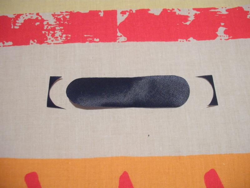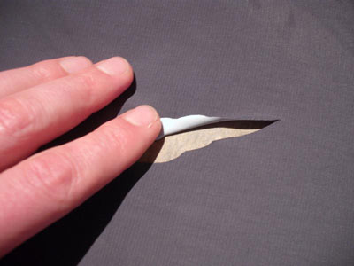 I’ve already put the paper in the hole, and aligned it. All that’s needed is to insert and align the tape. Again, the tailor’s pencil can come in handy; in this case, draw a couple of dots in the centre of the tape, slightly inside the ends of the cut. You can use these to align the patch relative to the cut.