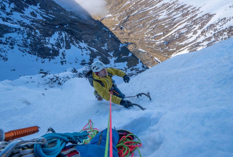 From the summit, the loch sits nestled under the Black Cuillins, and to the left you can enjoy views over the Small Isles with Rùm and the Isle of Canna in the distance. Making your way down to the loch, the route is grassy and goes past large rock slabs and, depending on the weather, through boggy patches. Once at the bottom there is a trail that will take you left, along the water’s edge and back around to Camasunary Bay. While an easy coastal path to follow there is one feature, the Bad Step. This is a long crack in a rock slab that you traverse across with the blue waters of Loch nan Leachd below you. This traverse isn’t for the faint hearted and requires some scrambling to negotiate the way across.