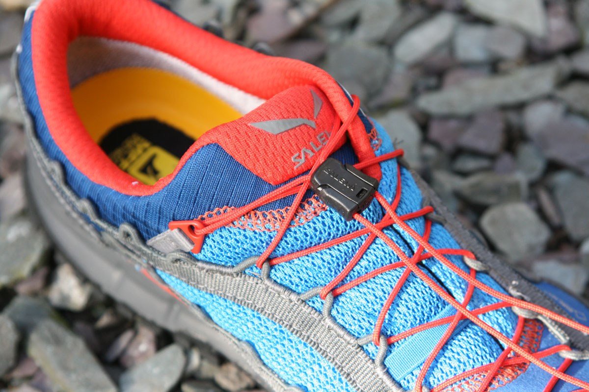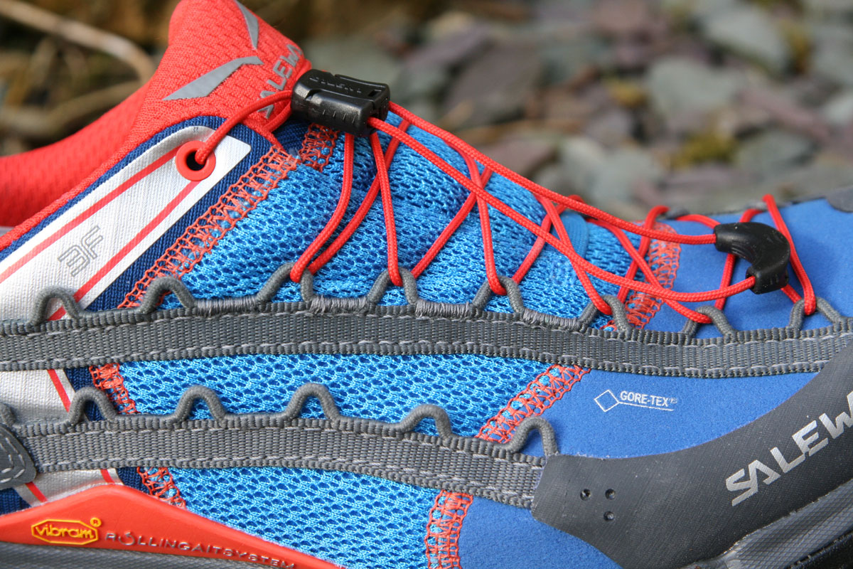 Not content with the unusual sole, Salewa has also gone to town on the uppers: for a start there’s a speeding lace system for rapid adjustment, but that’s not all. Slightly lower down are a second set of lace anchoring points so you can increase hold by swapping some of the lacing points for lower ones.