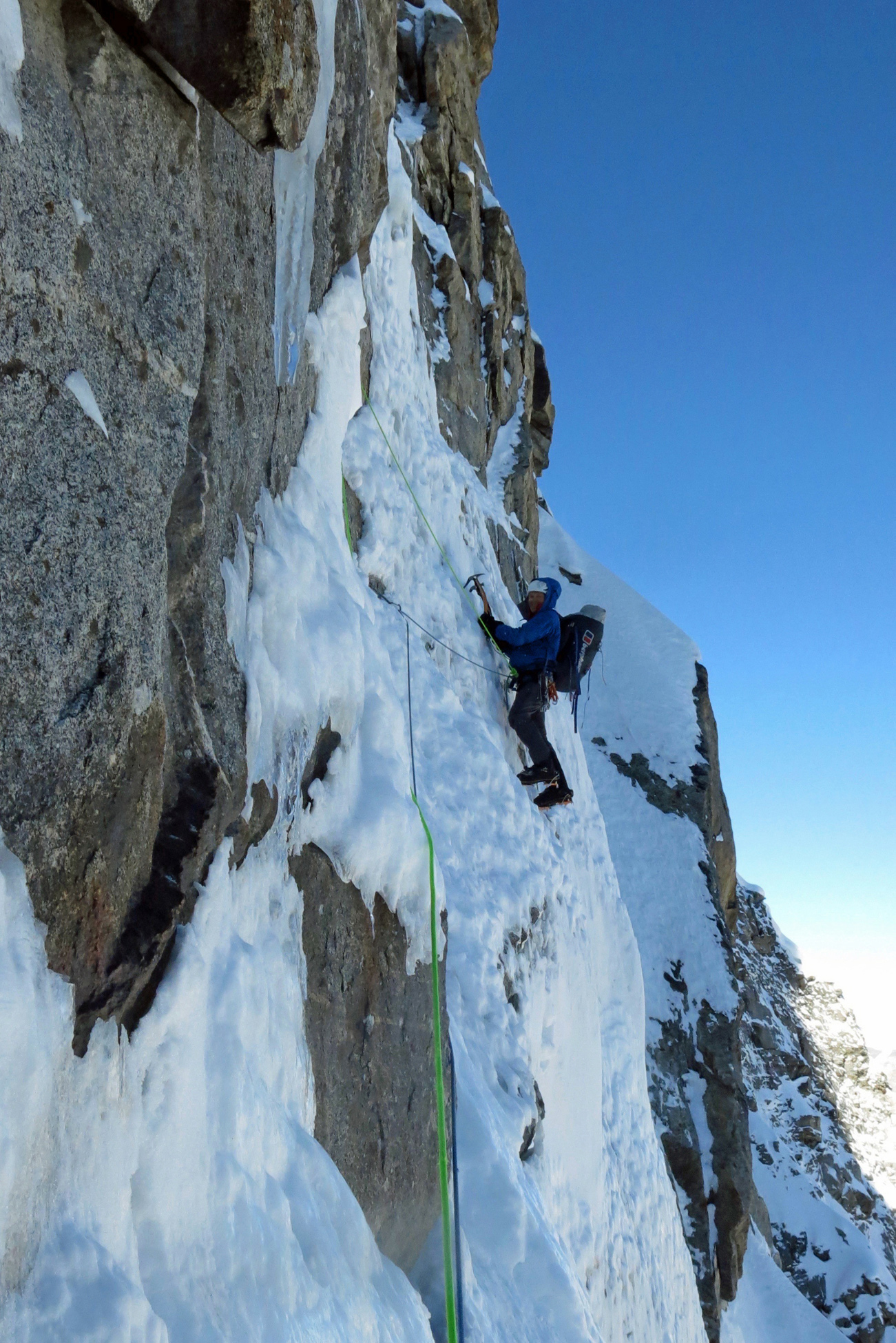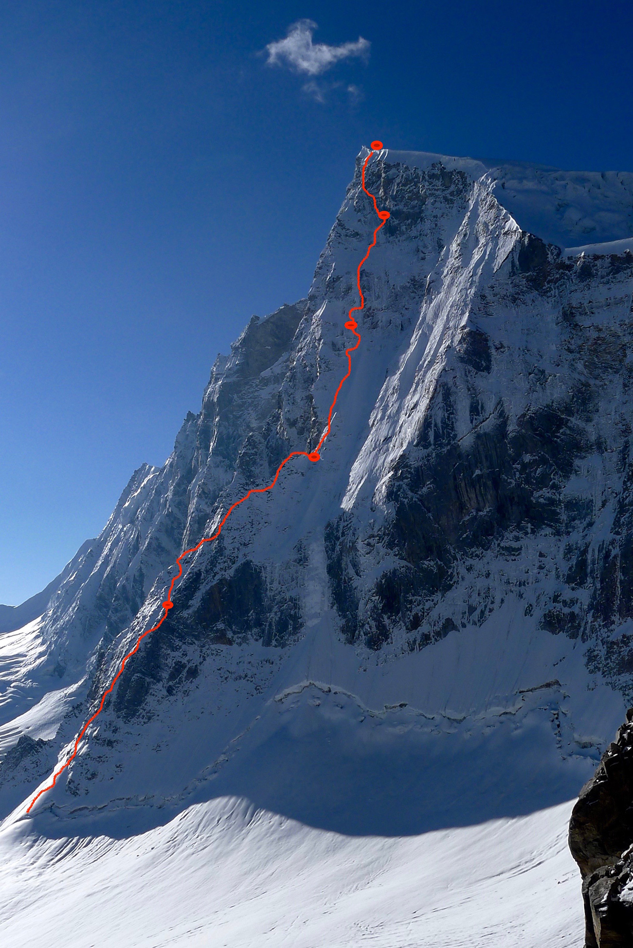 ‘Heavy snowfall on dry cold rock made for challenging conditions. For two days we swept away snow and inched up the disturbingly blank rock below’