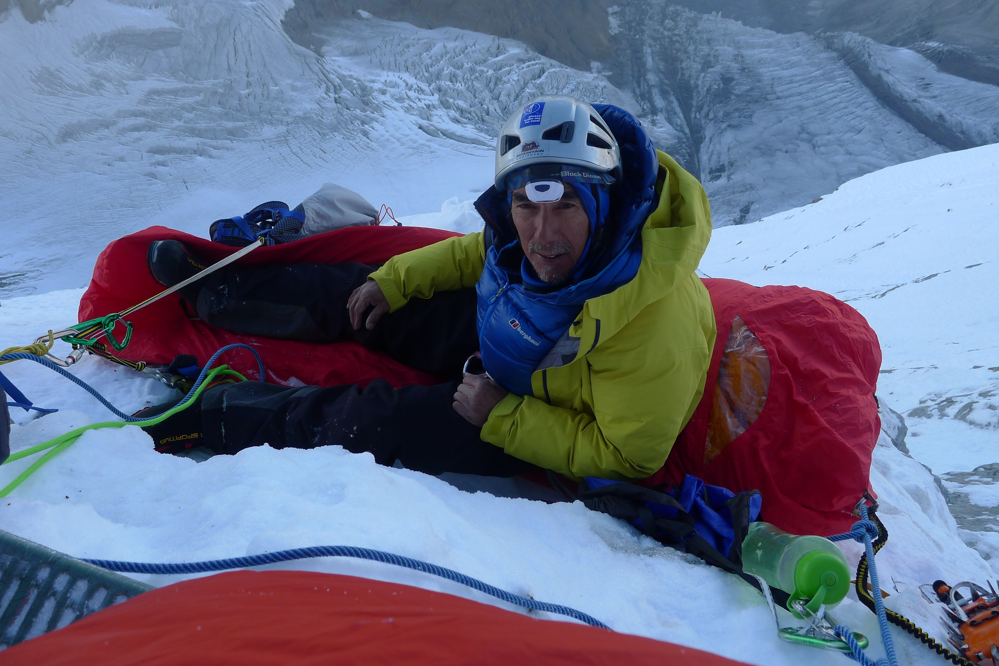 “Day four was the crux day – fantastic white ice climbing with several pitches just within our limits. Even with numerous unplanned halts, superlatives abounded as we ended the day lying on separate small ledges cut in the ice.