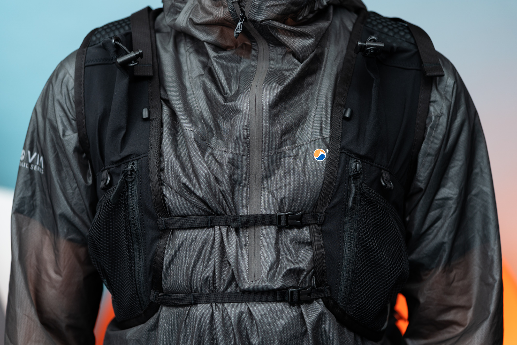 The harness is essentially a trail running vest. It conforms to the shape of your body and offers a number of adjustment options, allowing you to adjust the back length and also the height and width of the straps. A narrow yoke on the spine and 5 other connection points link this harness with the pack, all-in-all making for a very stable carry that doesn’t swing about or bounce too much – even when you’re at running pace.