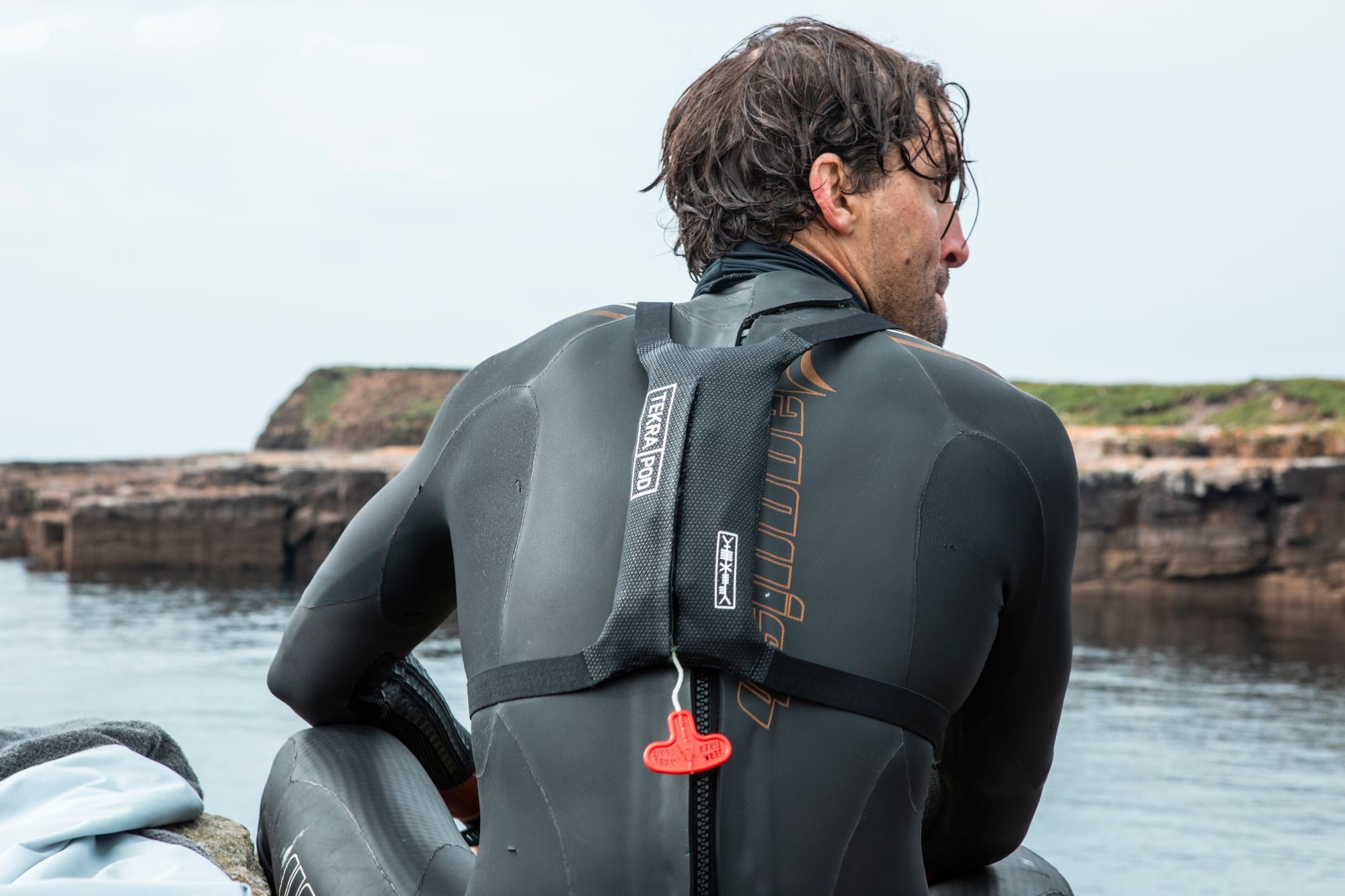 “The TekraPod ensures the ultimate in safety, speed and performance in the water,” adds John. “It’s neutrally buoyant and doesn’t interfere with the swimmer’s body position, or their swim mechanics. Because it’s located between the shoulder blades in a narrow hydrodynamic pouch, it has little or no drag effect and has the sticking power of a limpet. The internal bladder inflates at the pull of a cord, the elongated bladder can then be used to wave for attention, to rest on while assistance arrives or given to other water users who might need help. It is also fully reusable by replacing a 16g CO2 cylinder, just like the ones used for bikes.”