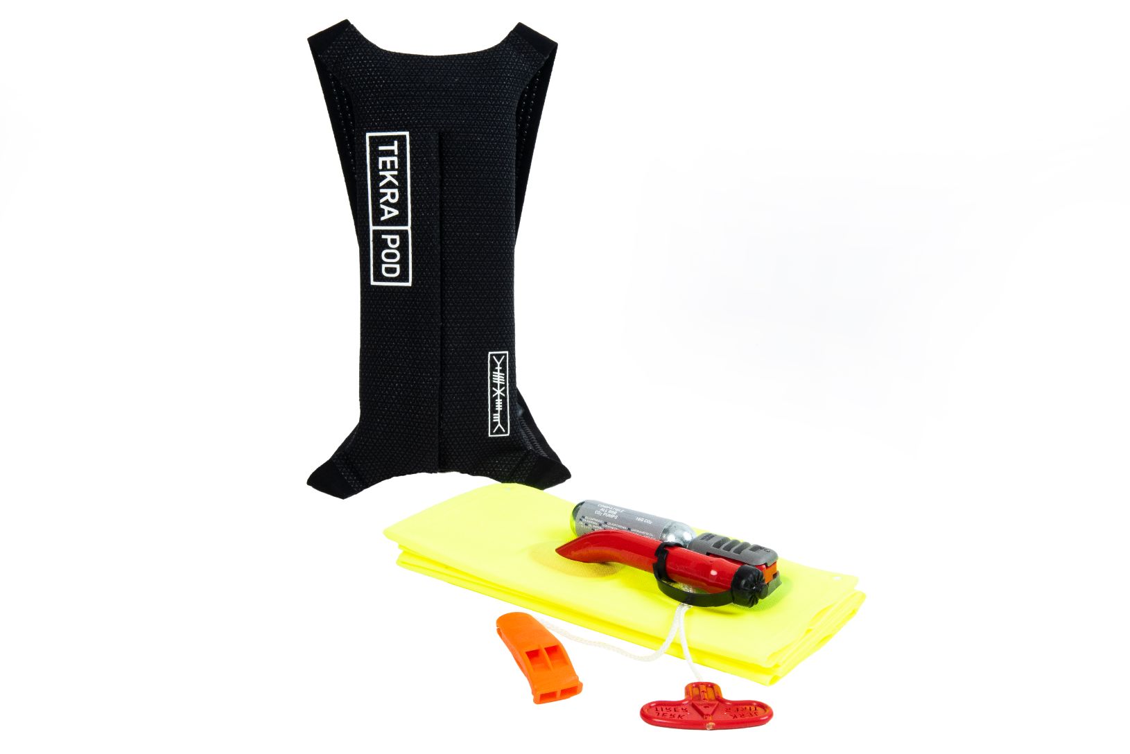 TekraSport’s hero product is the TekraPod, which is confidently billed as “a revolutionary alternative to a traditional tow float.” It’s a race legal, safety device that you wear on your back (almost like one of those super-streamlined, minimalist hydration bladder backpacks). When you need support or need to alert people for help, it can be easily inflated within an instant.