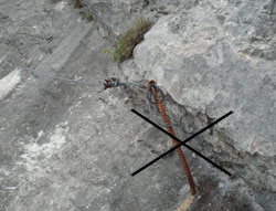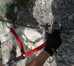 The mid-point of your KISA needs to be attached to your harness with a locking karabiner. The other two ends can be clipped alternately to the cables in the rock.